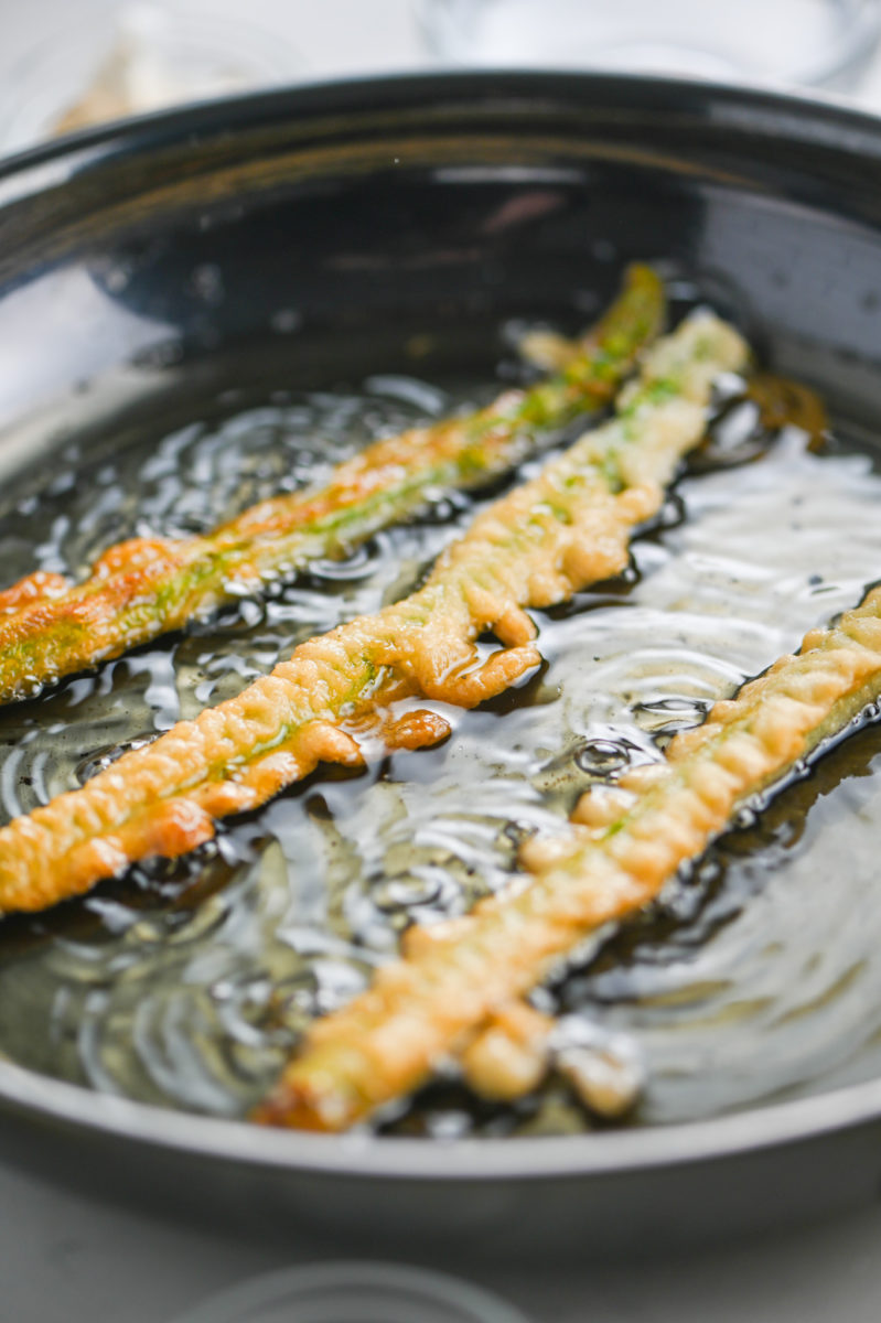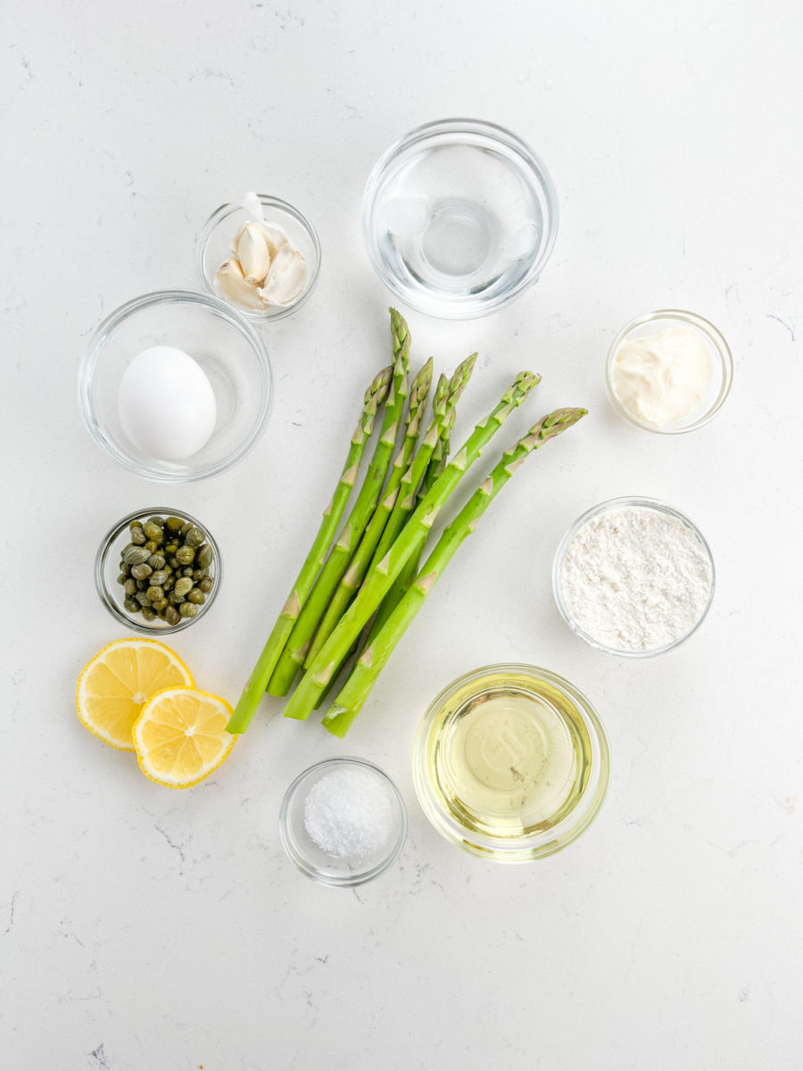 • STEP #4: Fry the asparagus fries, in batches if necessary to not over crowd the pan. Transfer to a paper towel lined plate. Sprinkle with salt and serve with caper aioli.