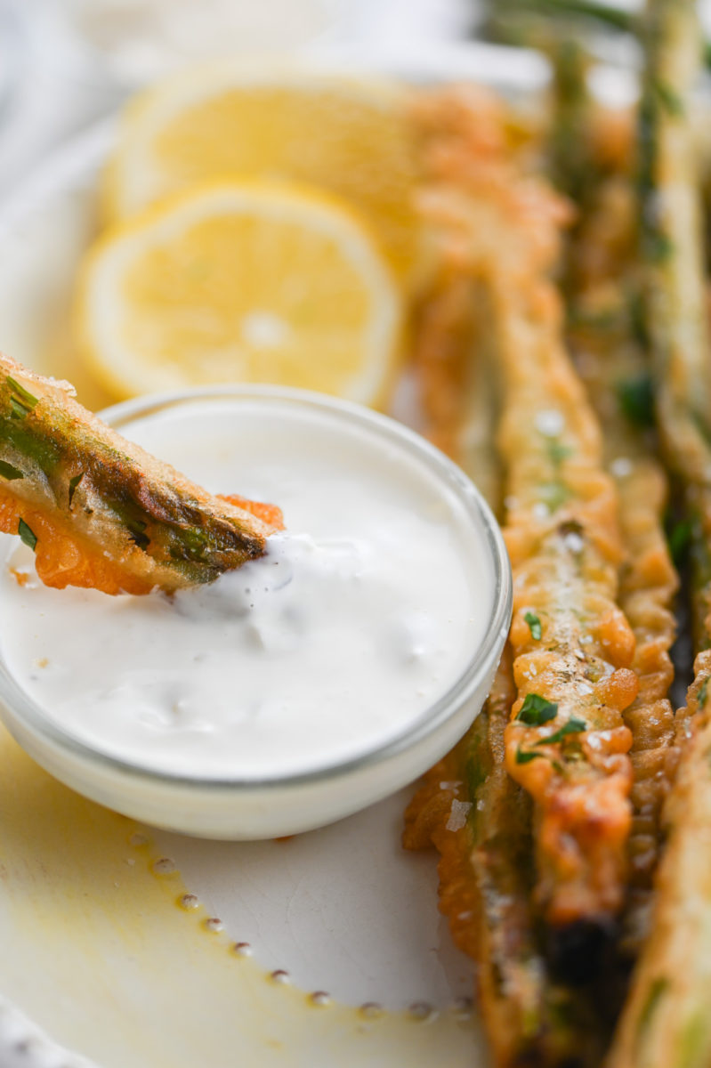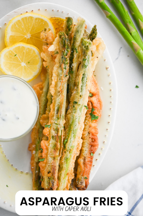 Asparagus Fries are lightly battered, fried until golden and dipped in a creamy caper aioli. They are every bit as addicting as they sound.