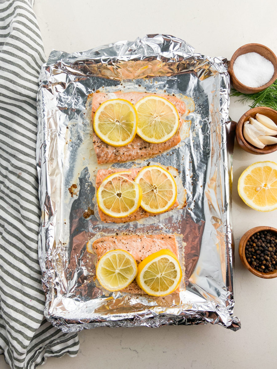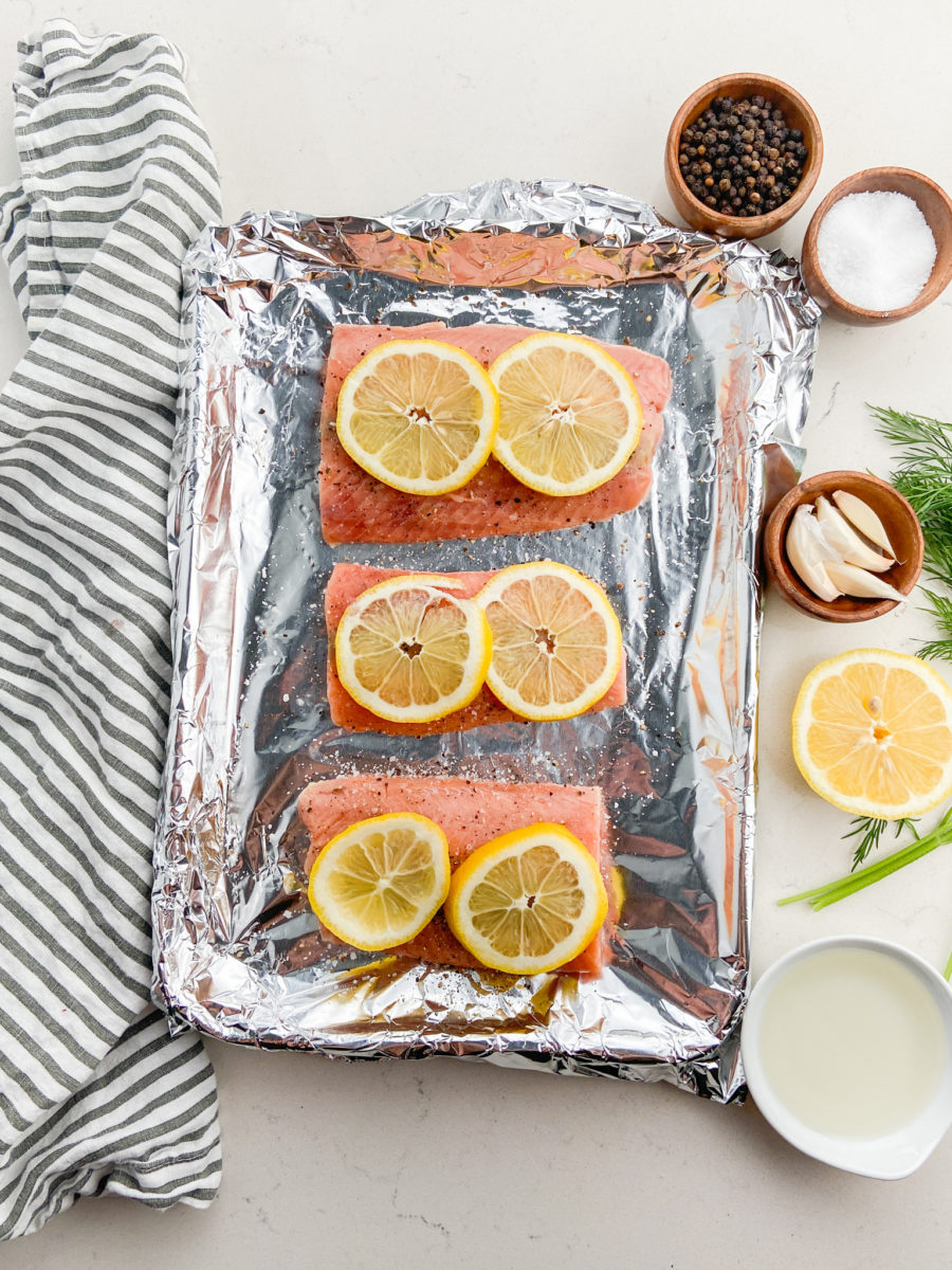 STEP #2: Place salmon filets on the prepared baking sheet and sprinkle with salt and pepper. Place sliced lemon on top. Bake in preheated oven for 10 minutes. Remove, tent with foil for 10 more minutes. The salmon will continue to cook during this time.