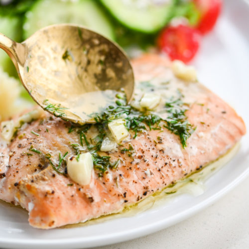 This Baked Salmon with White Wine Dill Sauce is a great way to prepare it. The salmon is tender and cooked perfectly. But the star of the show just might be the buttery white wine dill sauce. It comes together while the salmon is cooking and then is drizzled over the top.