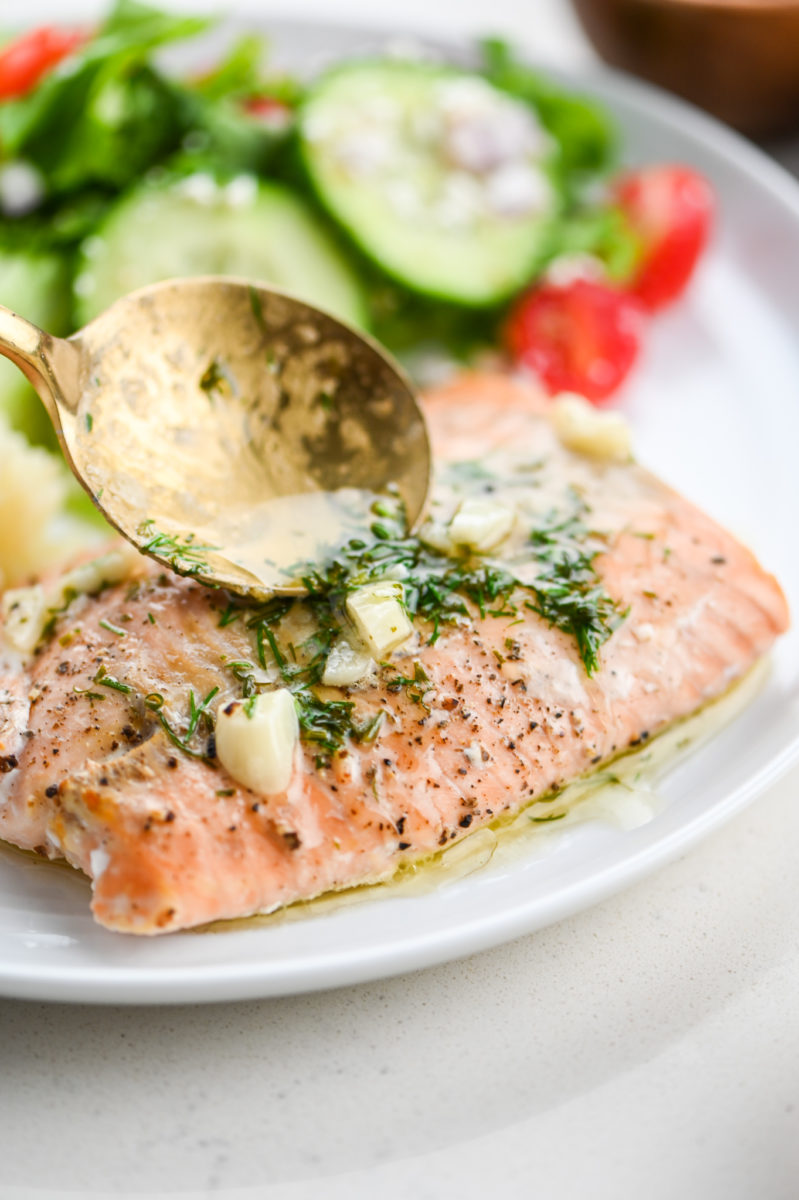 STEP #3: Make the sauce while the salmon is cooking. Melt butter in a skillet over medium heat, once melted add garlic and cook 30 seconds to 1 minute or just until fragrant. Pour in wine Cook for 5 minutes or until sauce reduces by 1/3. Stir in fresh dill and remove from heat.