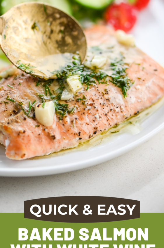 This Baked Salmon with White Wine Dill Sauce is a great way to prepare it. The salmon is tender and cooked perfectly. But the star of the show just might be the buttery white wine dill sauce. It comes together while the salmon is cooking and then is drizzled over the top.