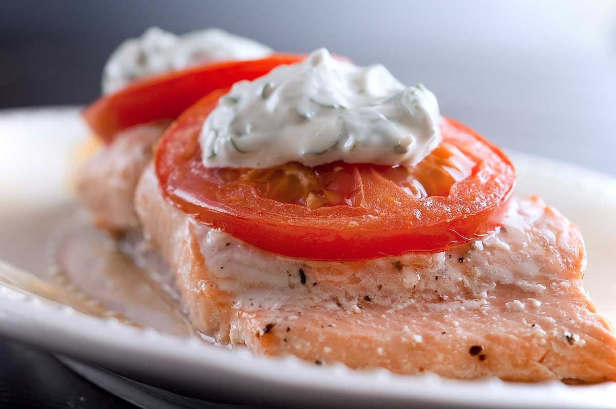So far this year my new year’s resolution to get more fish into my diet seems to be right on track. The fact that it is currently salmon season is helping a lot. I simply can’t resist the beautiful pink lusciousness that is wild salmon. Now the task is to continue to think of new ways to serve it. This salmon is baked with garlic and tomatoes and then topped with a refreshing basil mayonnaise. I understand that basil mayonnaise on salmon sounds a bit odd, but trust me on this one. I wouldn’t steer you wrong.