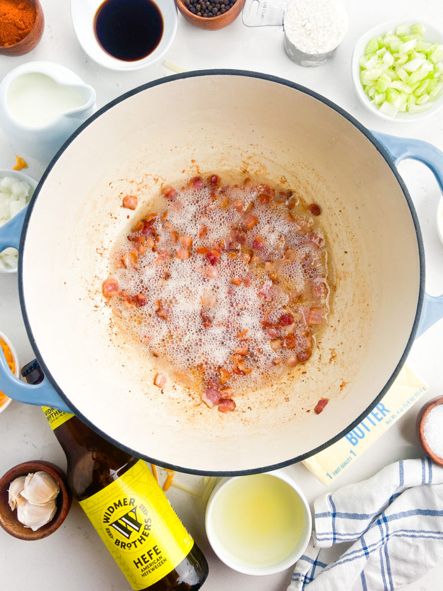 STEP #1: Cook bacon in a large pot over medium heat until bacon has rendered its fat and is browned. Transfer bacon to a paper towel lined plate and set aside. Reserve 1 tablespoon of pan drippings.