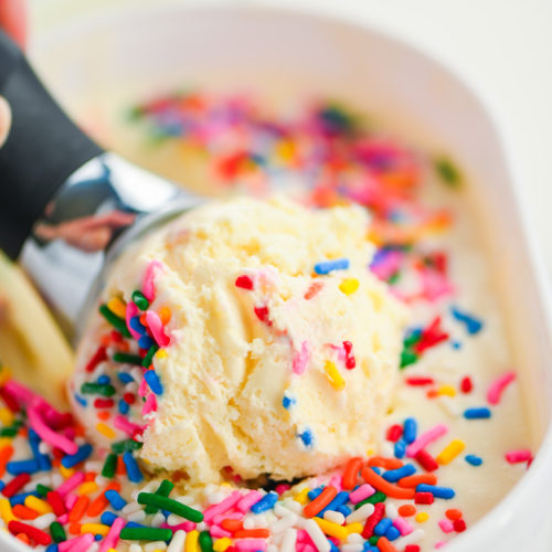 Birthday Cake Batter Ice Cream is a deliciously, creamy homemade ice cream. Made with cake mix and sprinkles this festive treat is perfect for parties!