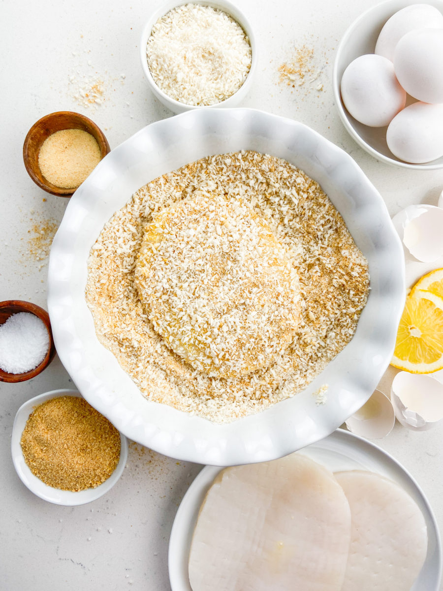 STEP #2: Combine panko, plain bread crumbs, granulated garlic and salt together in a shallow bowl. Gently press the calamari steaks into the seasoned breadcrumbs to coat both sides.