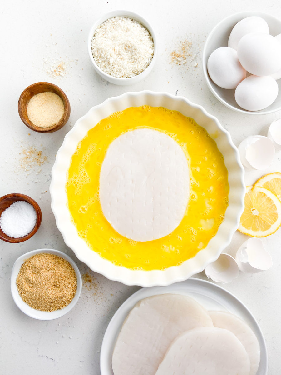 STEP #1: Pat dry the calamari steaks and then dip them in beaten egg. Let the excess egg drip off.