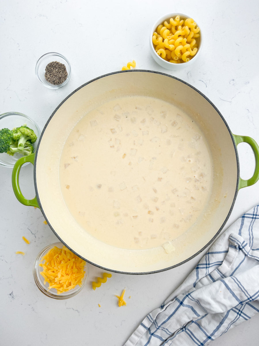STEP #4. Add pasta and broccoli to the cheese sauce. Mix well to ensure that all the pasta and broccoli is coated in the sauce. Season to taste with more salt and pepper.