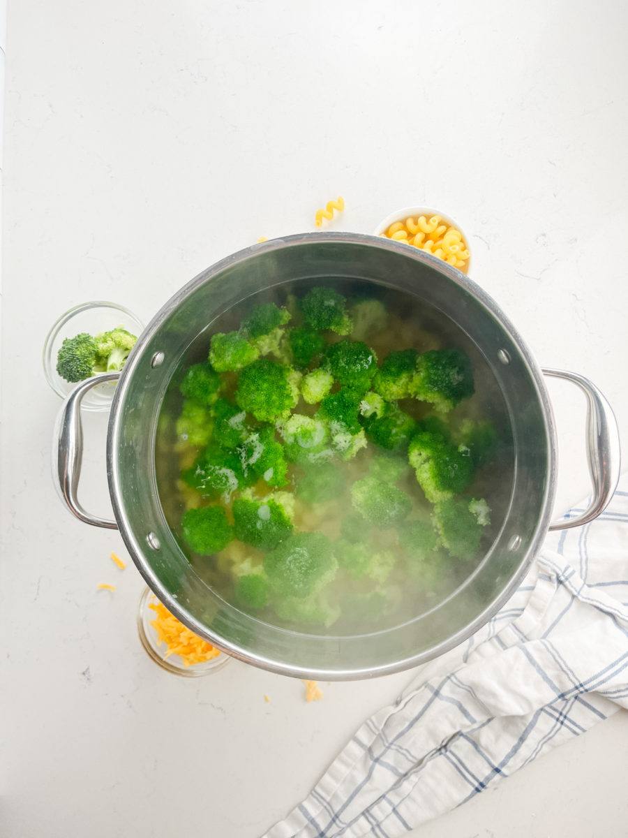 STEP #1: Bring a large pot of water to a boil. Once boiling add salt and pasta. Cook pasta according to package directions. When there are about 4 minutes left, add the broccoli and cook until bright green. Reserve 1/4 cup of pasta water. Drain pasta and broccoli.