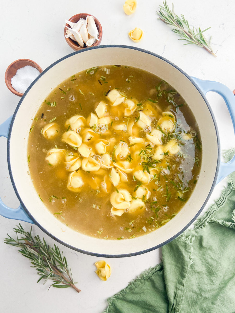 You guys, this soup is SO easy to make. Simply simmer the chicken, rosemary and about 10 cloves of garlic together for 20 or so minutes. Then add in the tortellini and cook just until the tortellini is cooked through. That’s it.