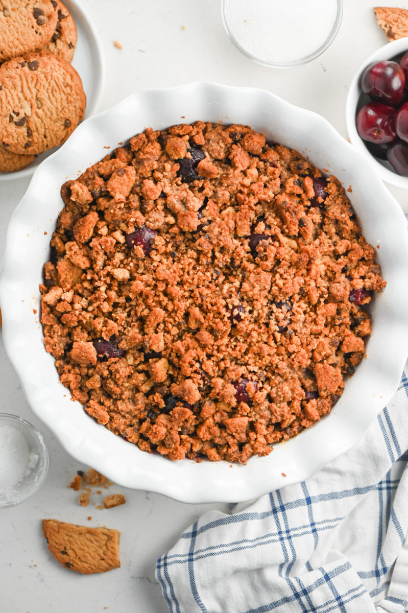 This Cherry Chocolate Chip Cookie Crisp is the perfect way to use summer cherries. Fresh sweet cherries topped with a chocolate chip cookie crumble and baked until bubbly.