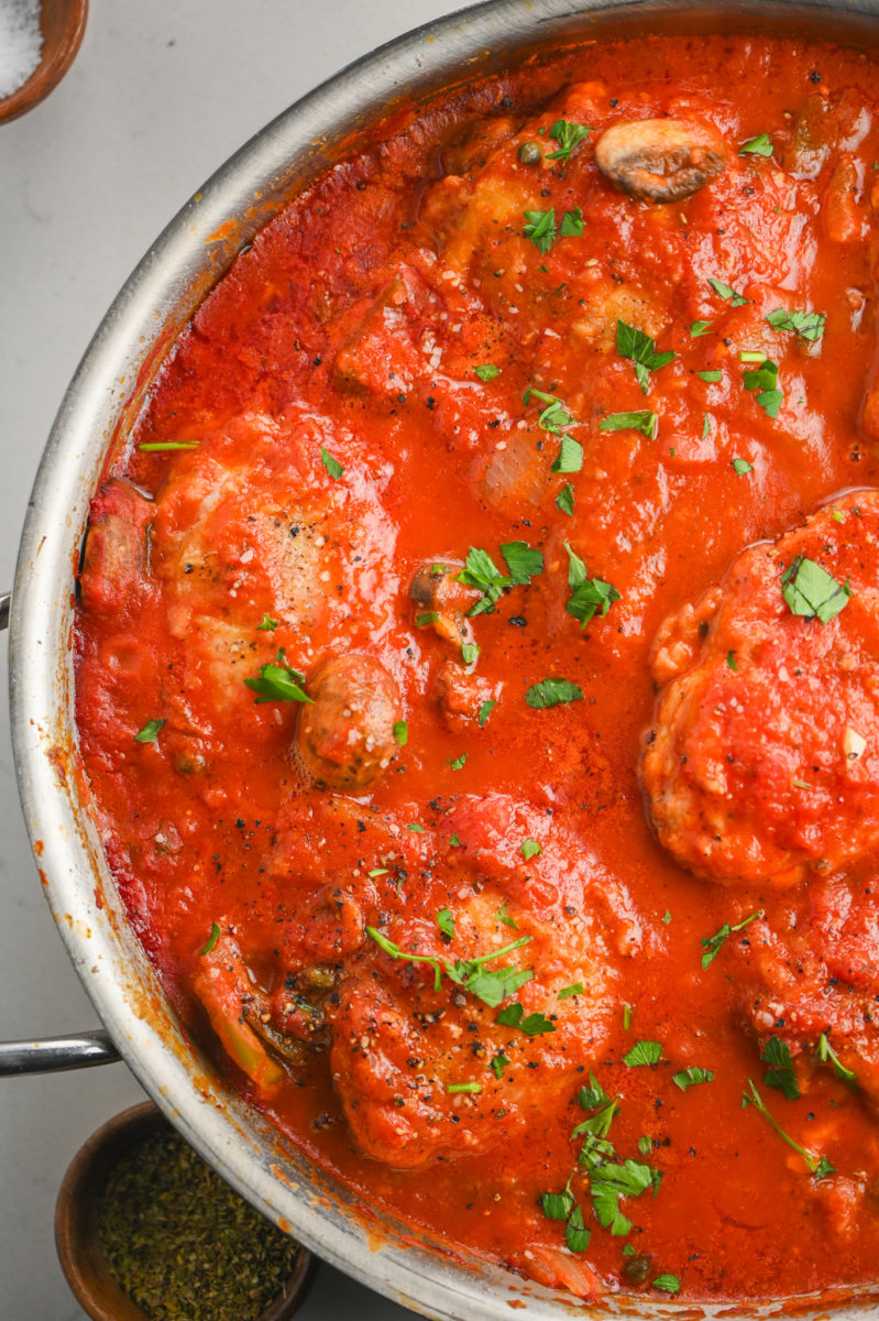 Chicken Cacciatore is a rustic dish made with chicken thighs simmered in a rich tomato sauce with vegetables, capers, wine and oregano.