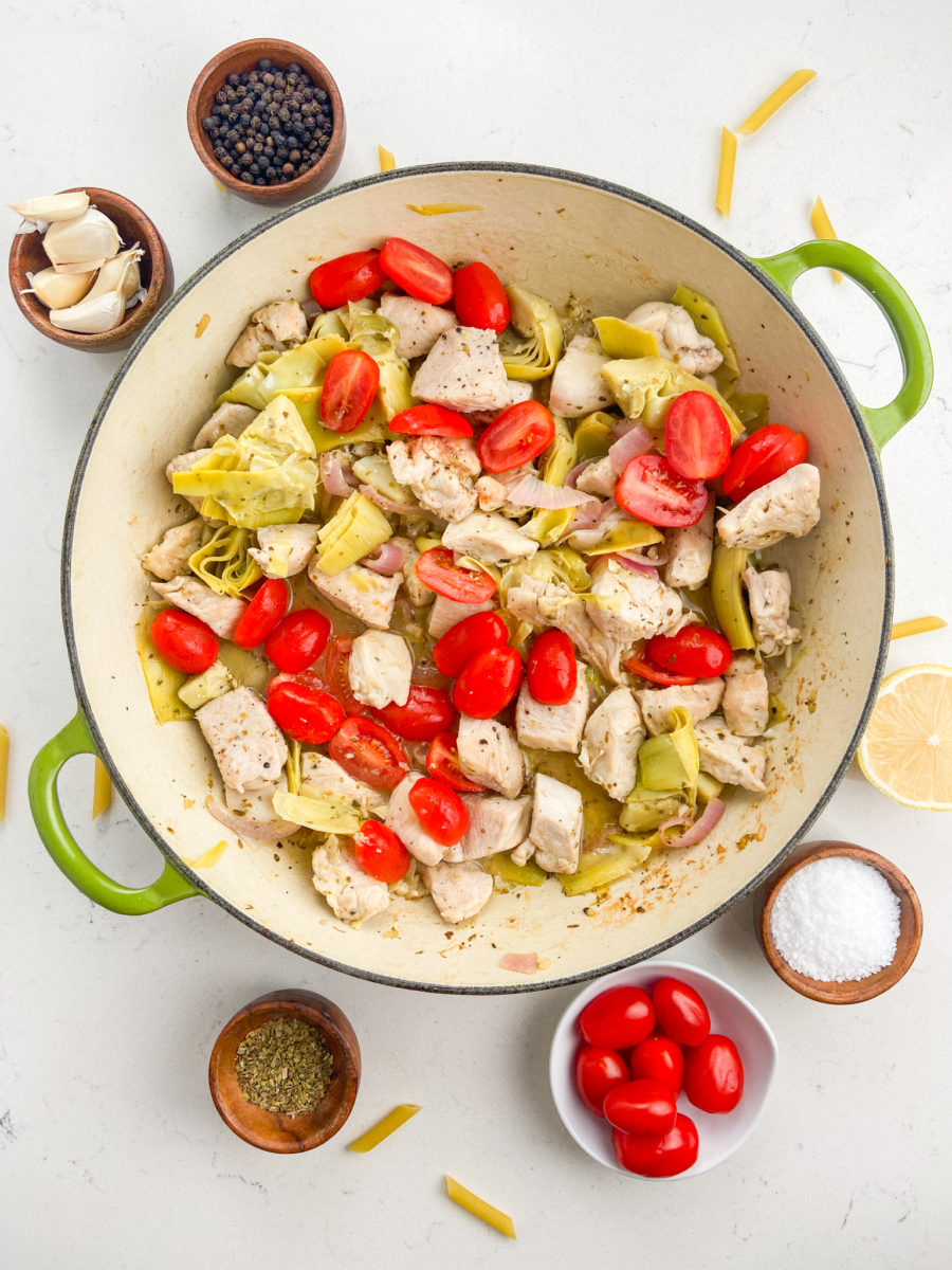STEP #3: Add in red onion, artichoke hearts and oregano. Cook for about 4 minutes or until the onion starts to soften and the chicken is cooked through.