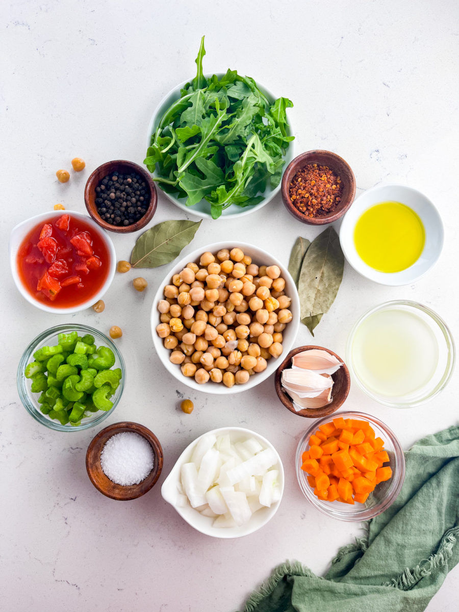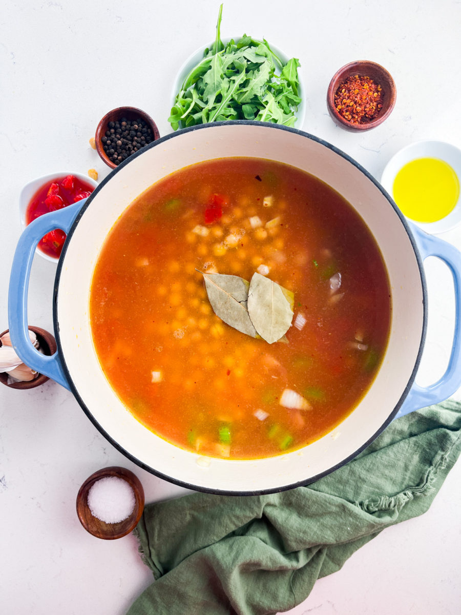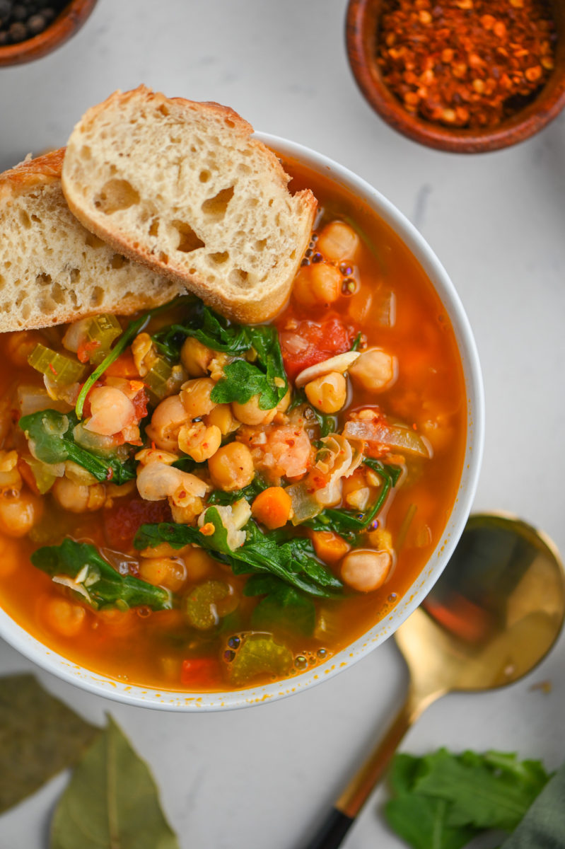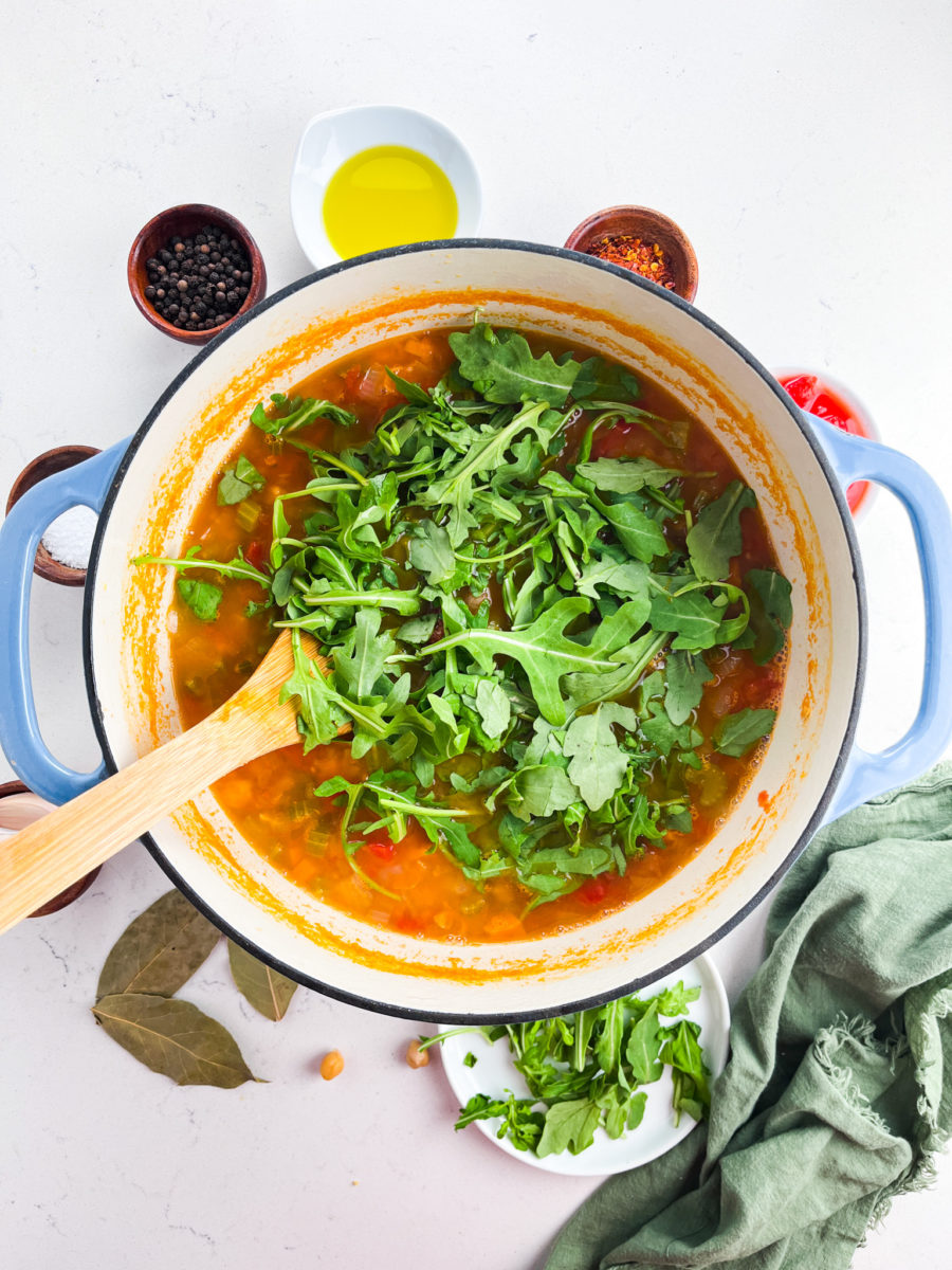 Chickpea Stew is a hearty, vegetarian soup that is perfect for a cold day! Full of all kinds of goodies like chickpeas, vegetables, tomatoes and arugula.