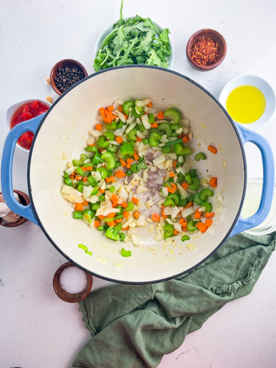 STEP #1: Heat olive oil in a large soup pot over medium heat. Add carrots, celery and onions. Cook just until the vegetable start to soften. About 5 minutes. Add garlic and crushed red pepper, cook for 30 seconds.