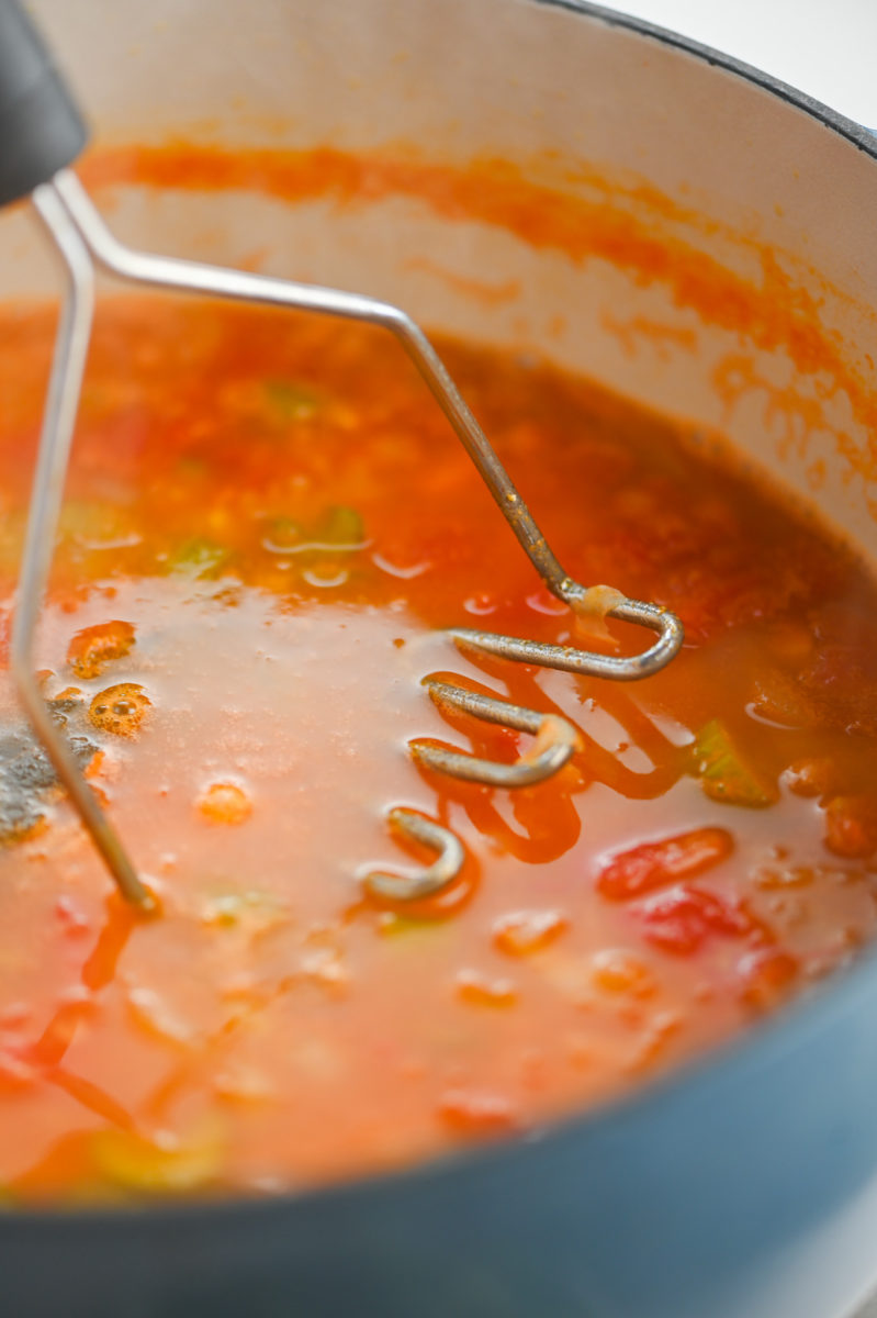STEP #3: After the soup has simmered for 15 minutes, use a potato masher to mash some of the chickpeas. The stew will still be chunky but this will help it thicken a bit as it cooks. Continue simmering for 10 – 15 minutes or until the soup cooks down and thickens to desired consistency.