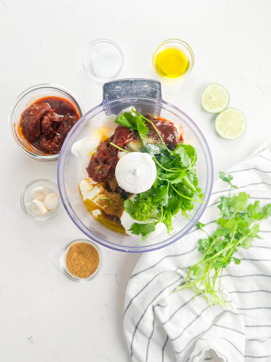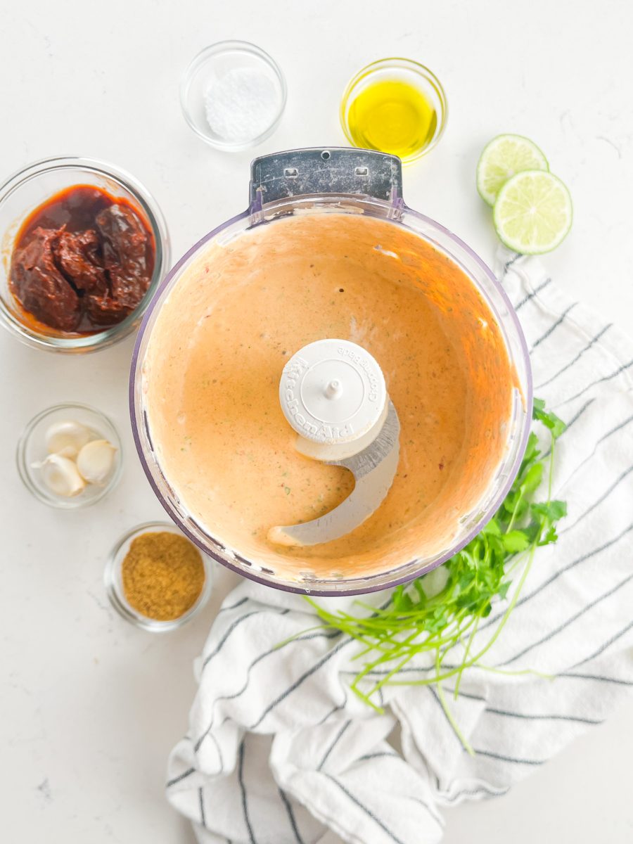 Making this creamy chipotle sauce is so easy! I use a small 3.5 cup food processor (affiliate link)and it works great for this. You can also make it in a blender.