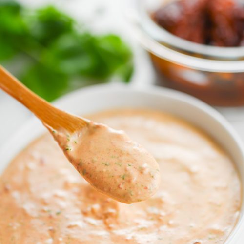 Creamy Chipotle Sauce made with greek yogurt, sour cream and smoky chipotles is going to be your new favorite sauce! It’s great on tacos, nachos and as a dip for chips and veggies.