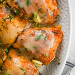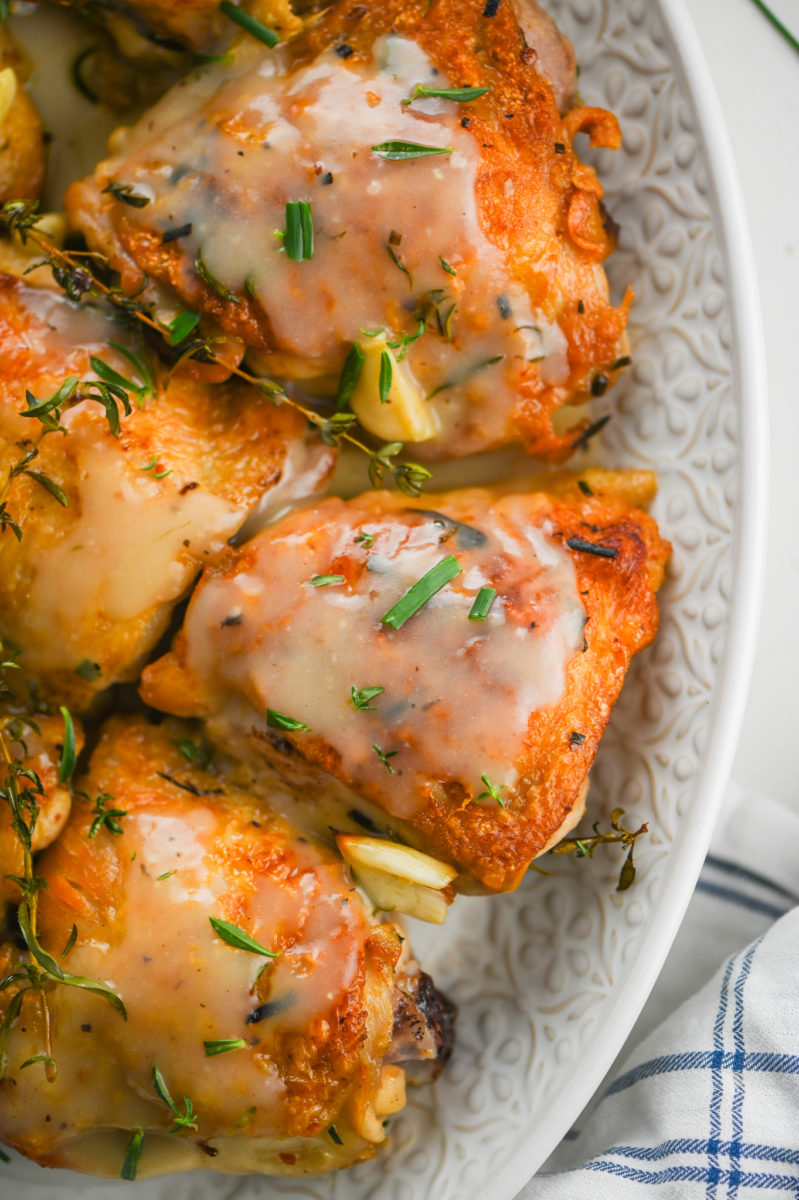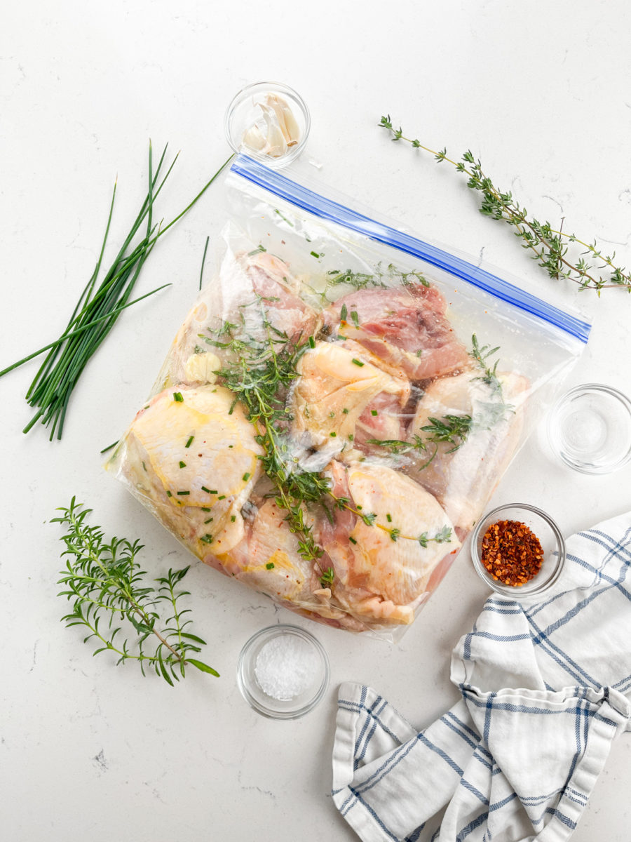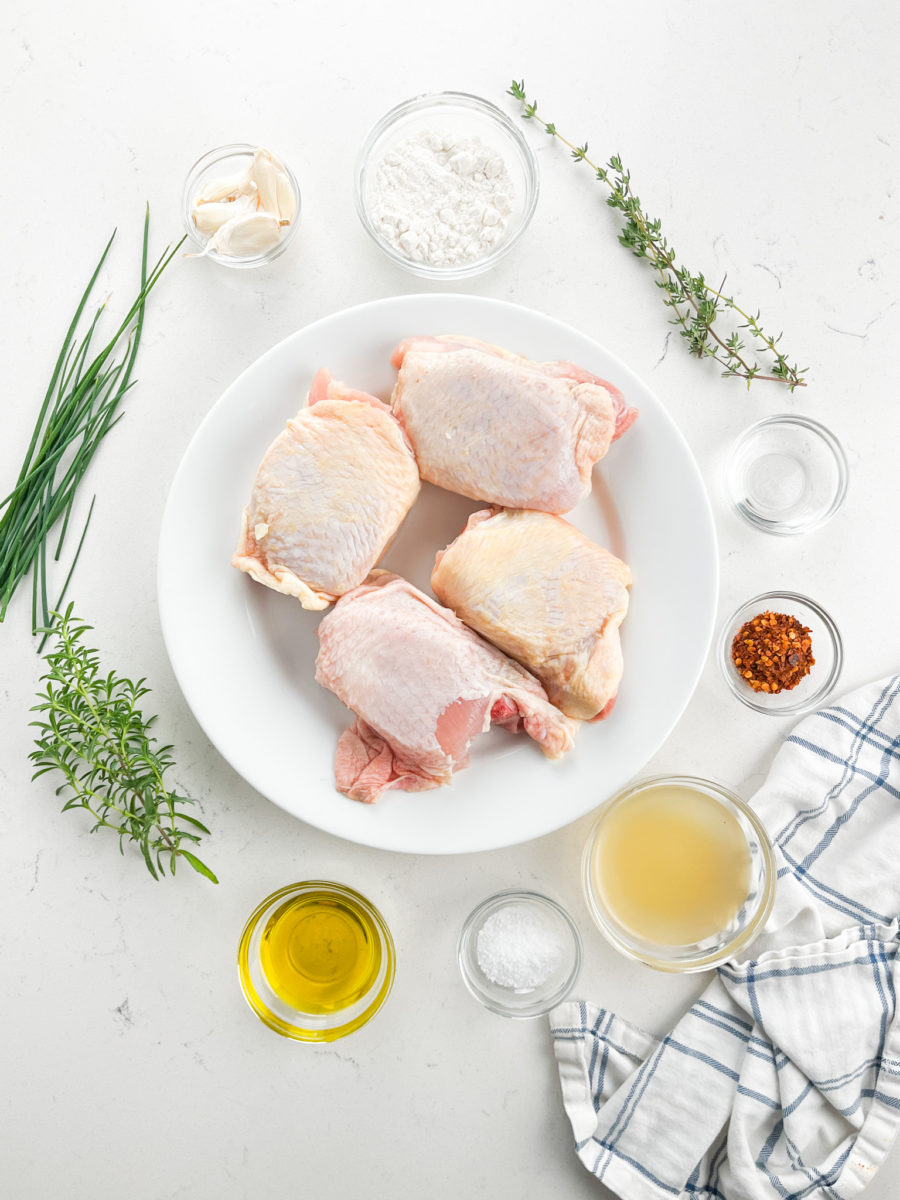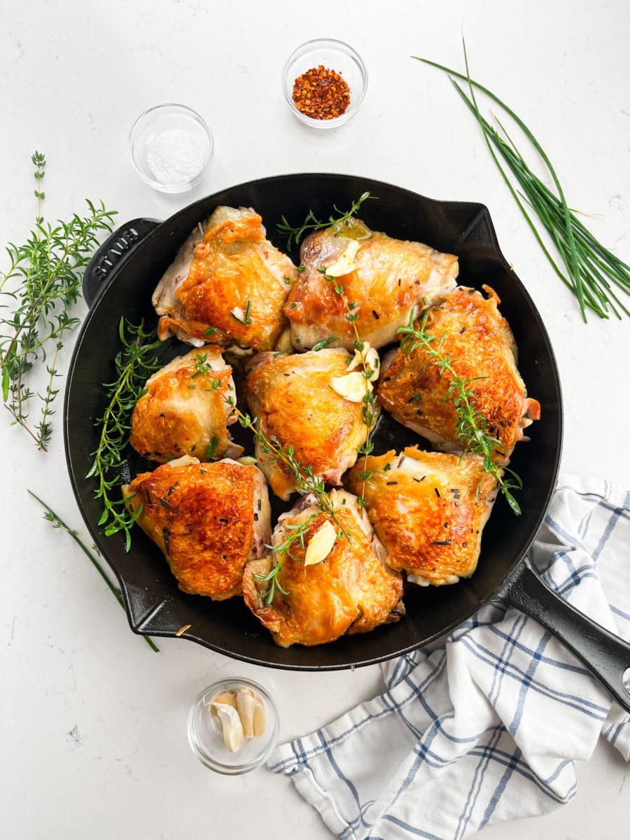 In addition to the chicken thighs the main players here are definitely the fresh herbs. I think you could probably make this with dried herbs but I’ve never tried. Just remember the key ratio when substituting dried herbs for fresh: 1 tablespoon fresh herbs = 1 teaspoon dried.