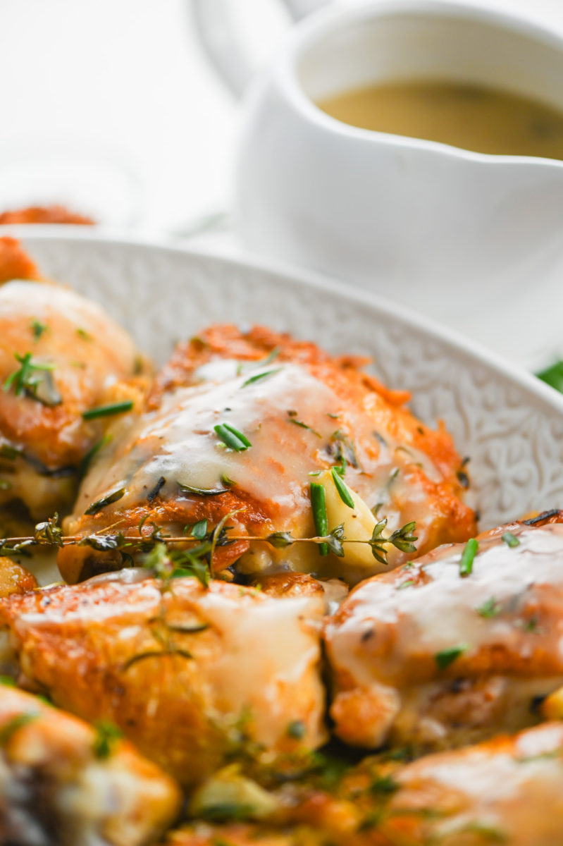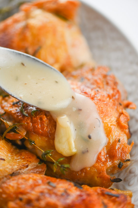 I’ve been testing this recipe for the last couple of months and each time I make it my family gobbles it up. I don’t know if it’s the crispy chicken skin that does it or if it’s the tender, juicy meat or if it’s the ridiculously good herb-y, garlick-y gravy. Honestly, it’s probably a combination of all of the above.