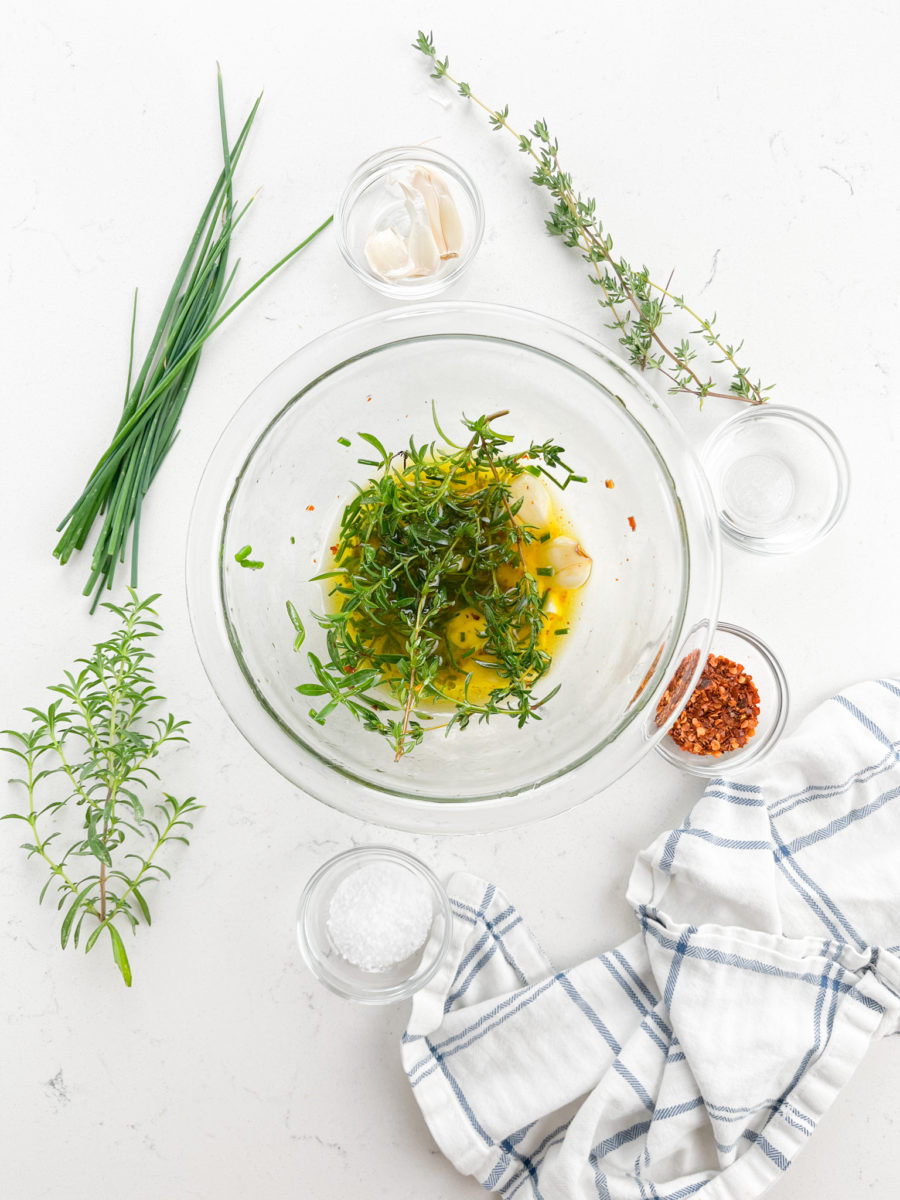 STEP #1: Combine oil, vinegar, fresh herbs, smashed garlic cloves, crushed red pepper and salt together in a bowl.