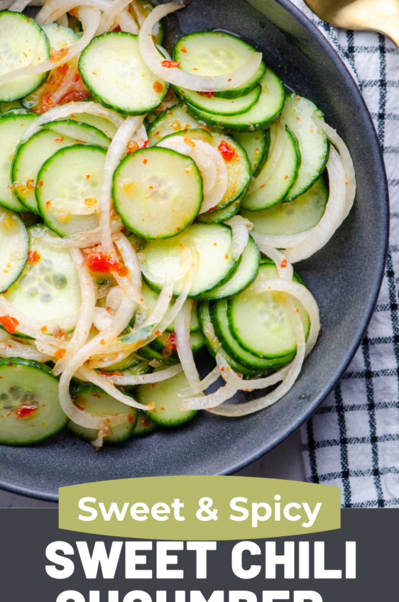 Sweet Thai Chili Cucumber Salad is crisp, cool, sweet n’ spicy. Thinly sliced cucumbers and onions tossed in a sweet chili vinaigrette make this a perfect summer side dish!
