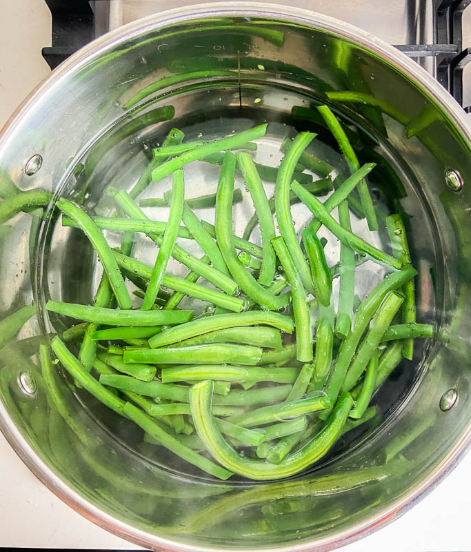 STEP 2: Blanch the green beans by cooking them in salted boiling water (I used about 1 tablespoon for the large pot) just until they are tender crisp and bright green, about 3 minutes.