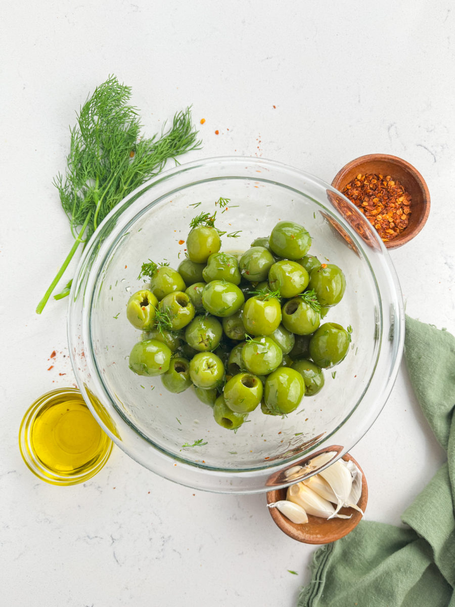 FRESH DILL: Fresh dill is going to give a really bright, herby flavor to these olives.