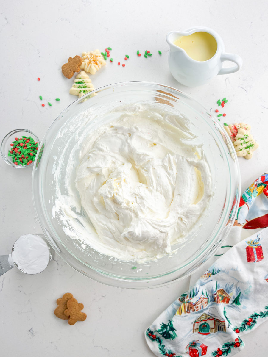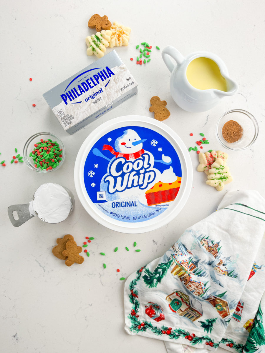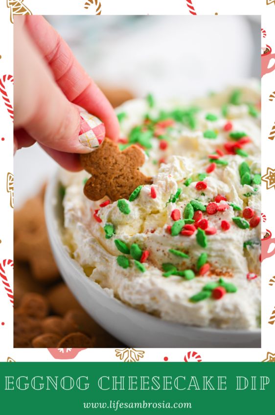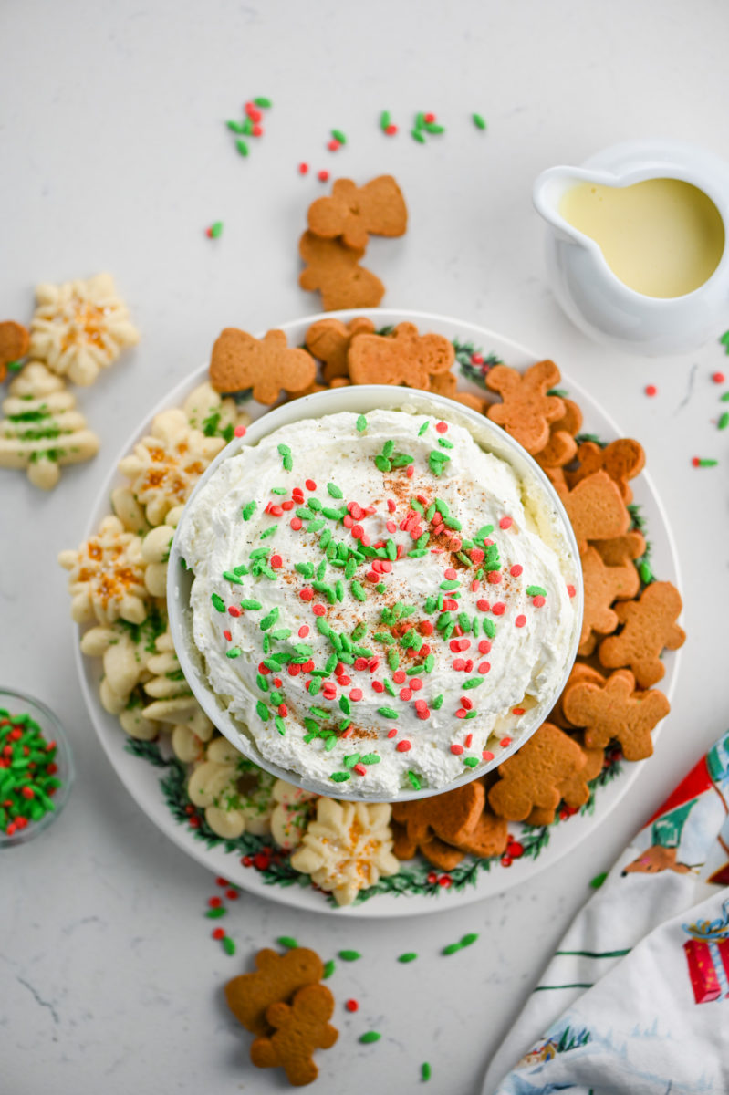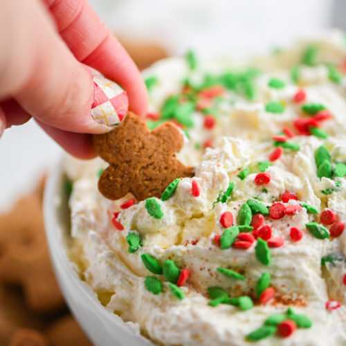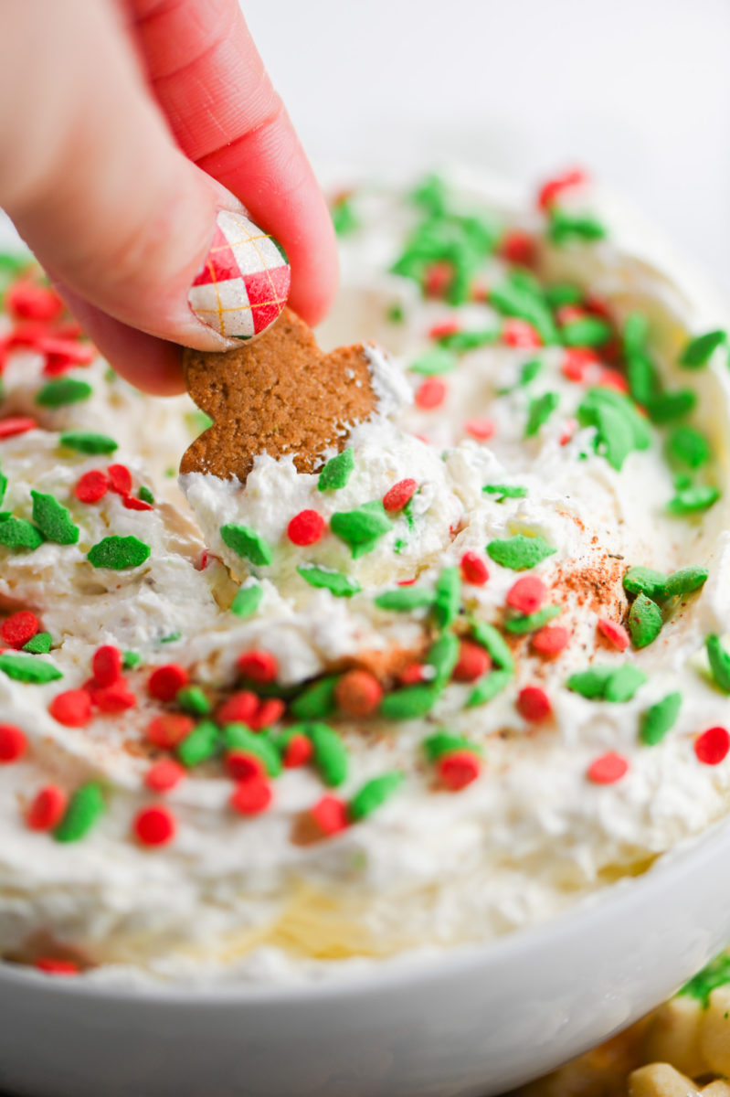 • Transfer dip to a serving bowl. Top with holiday sprinkles and a sprinkle of nutmeg. Serve with mini gingerbread men, spritz cookies, graham crackers, biscoff cookies or nilla wafers.