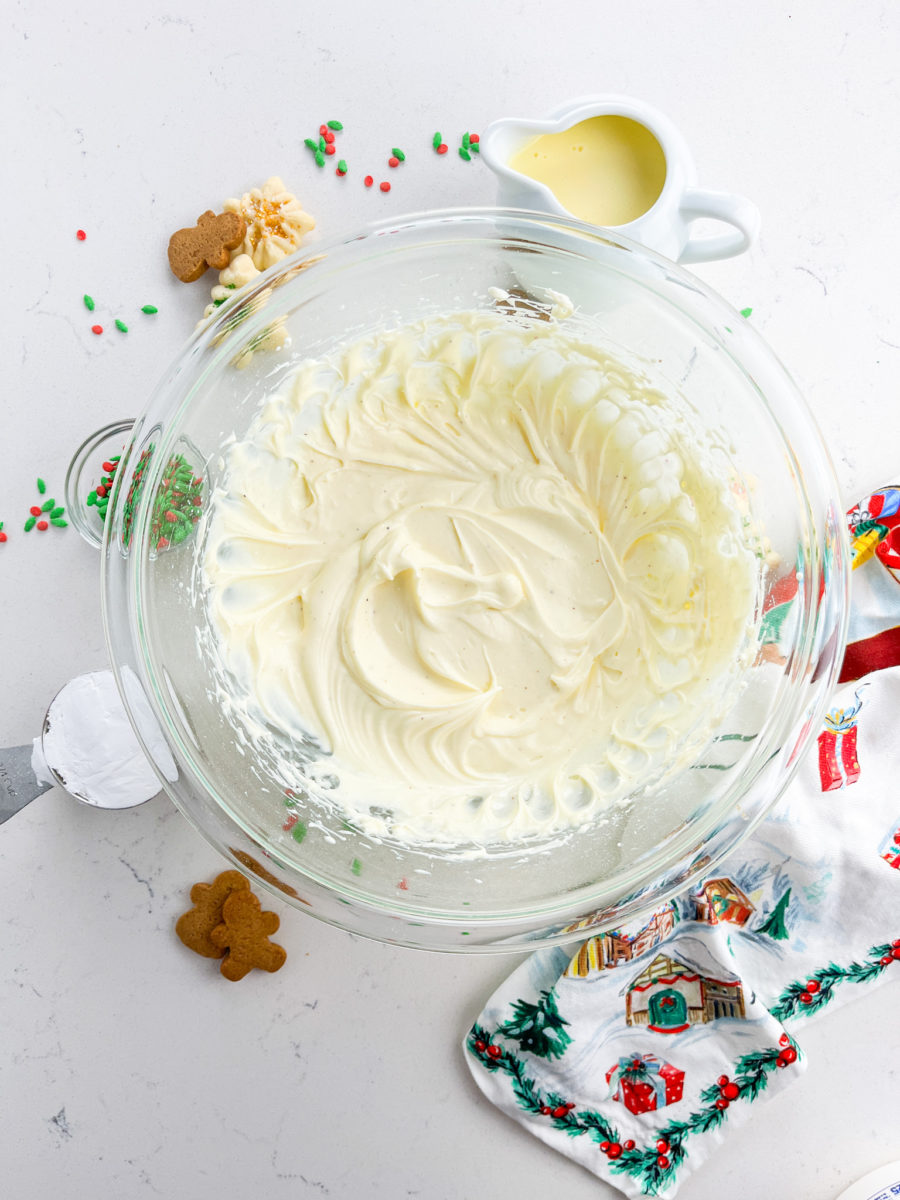 • STEP #1: Use a hand-mixer to combine cream cheese, eggnog, powdered sugar, and nutmeg until smooth.