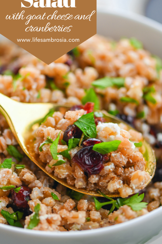 Farro Cranberry and Goat Cheese Salad is an easy salad recipe that is perfect for serving as a hearty side dish. It’s a must for your holiday table!