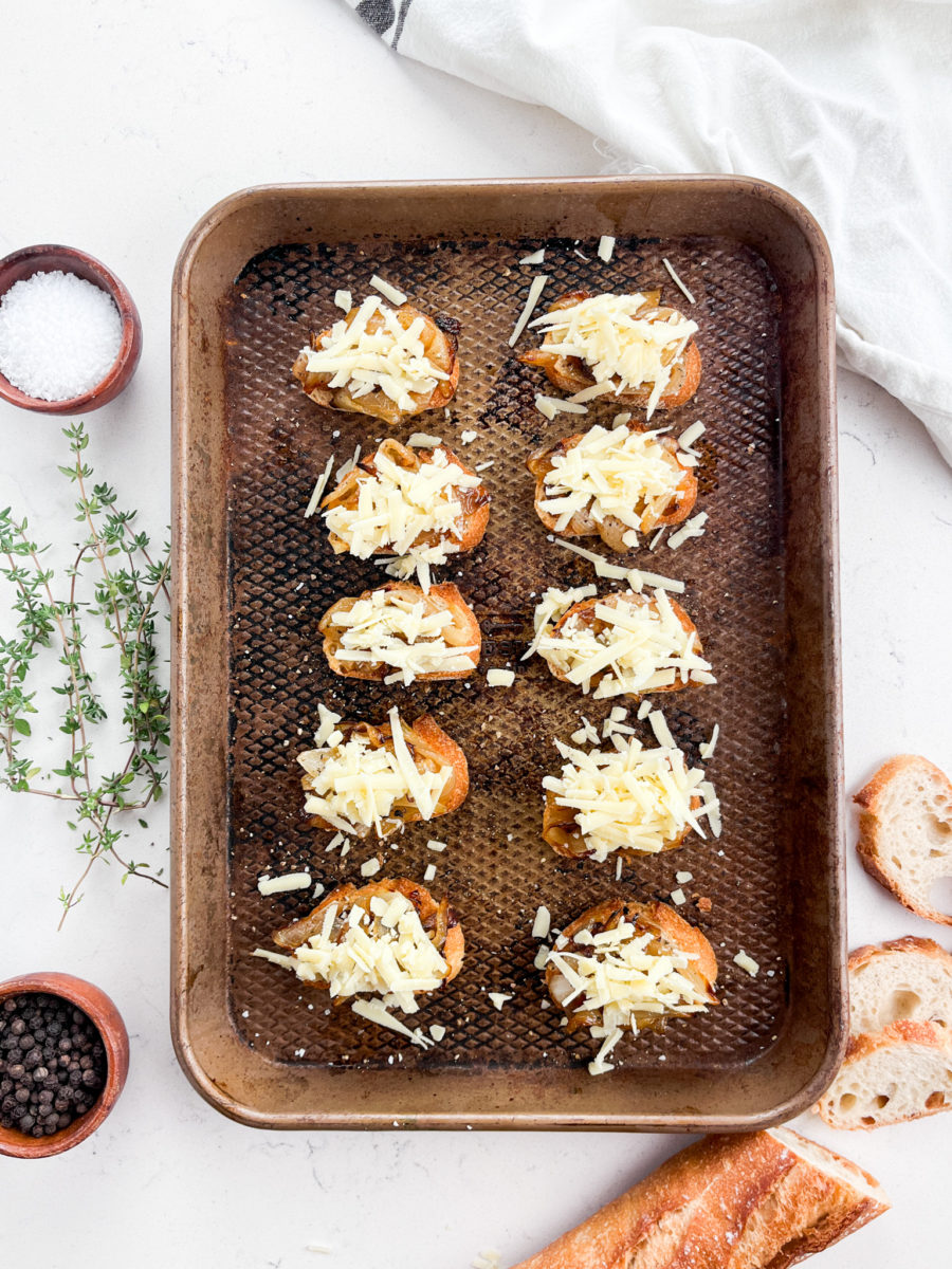 GRUYERE CHEESE: Gruyere cheese is classic with French Onion Soup so I knew that it had to be a part of these crostini as well.