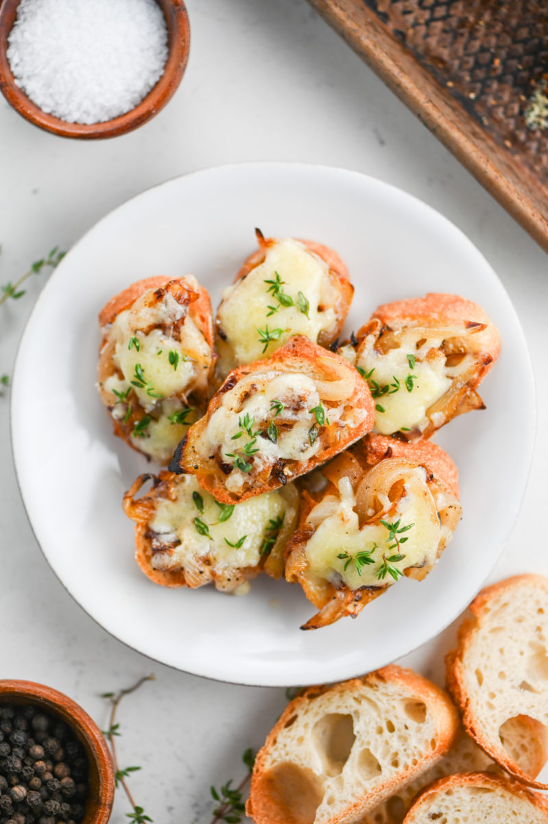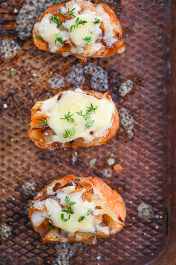French Onion Crostini made with sweet caramelized onions, salty Gruyère cheese and fresh thyme piled on crusty bread. A party perfect appetizer!