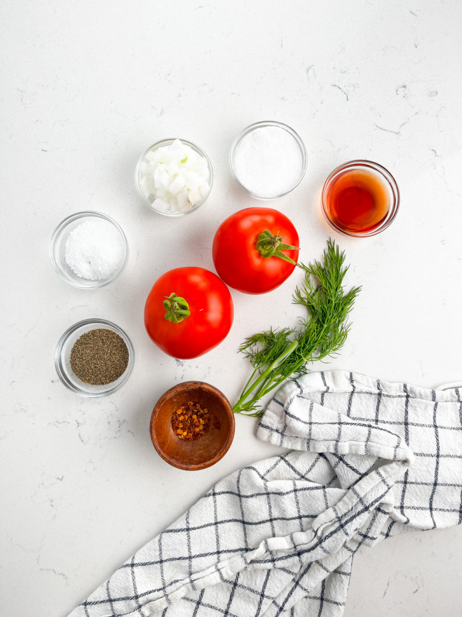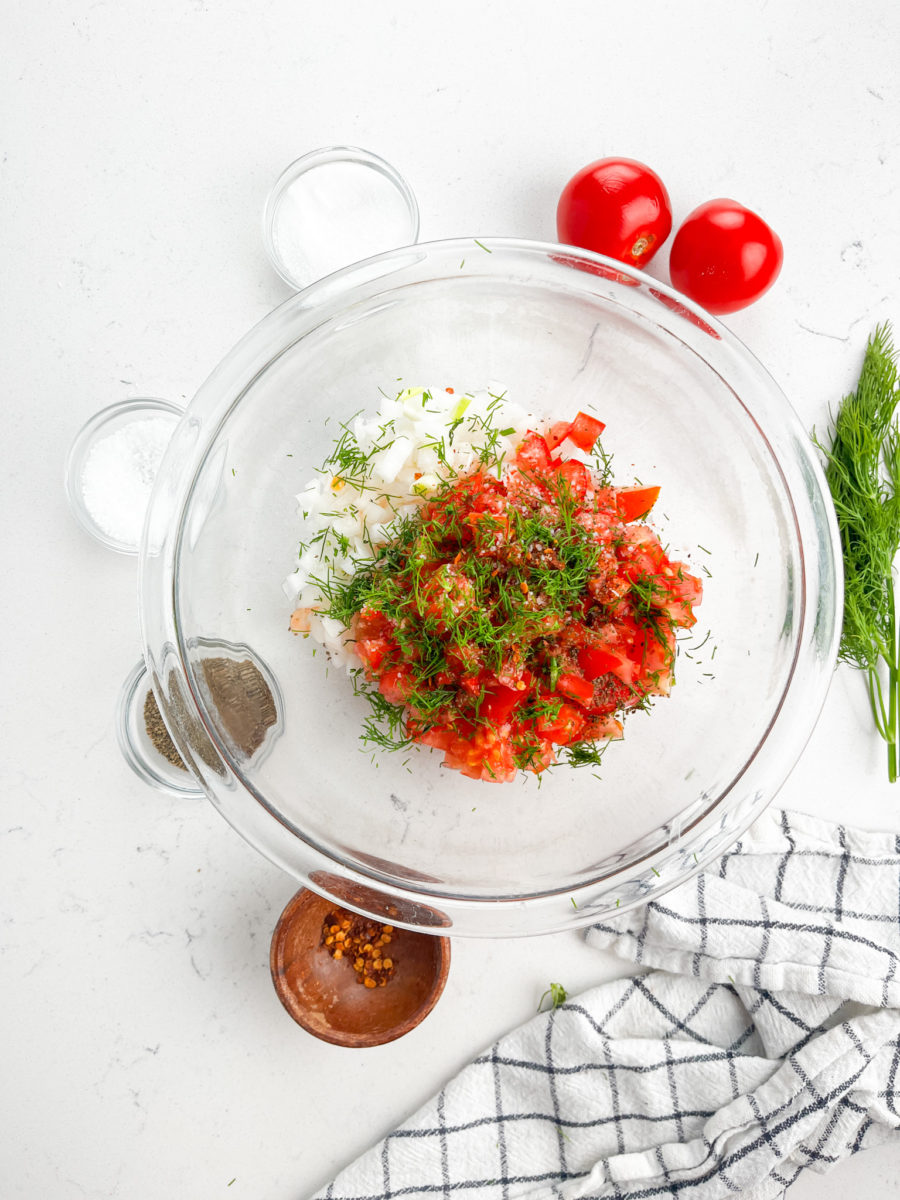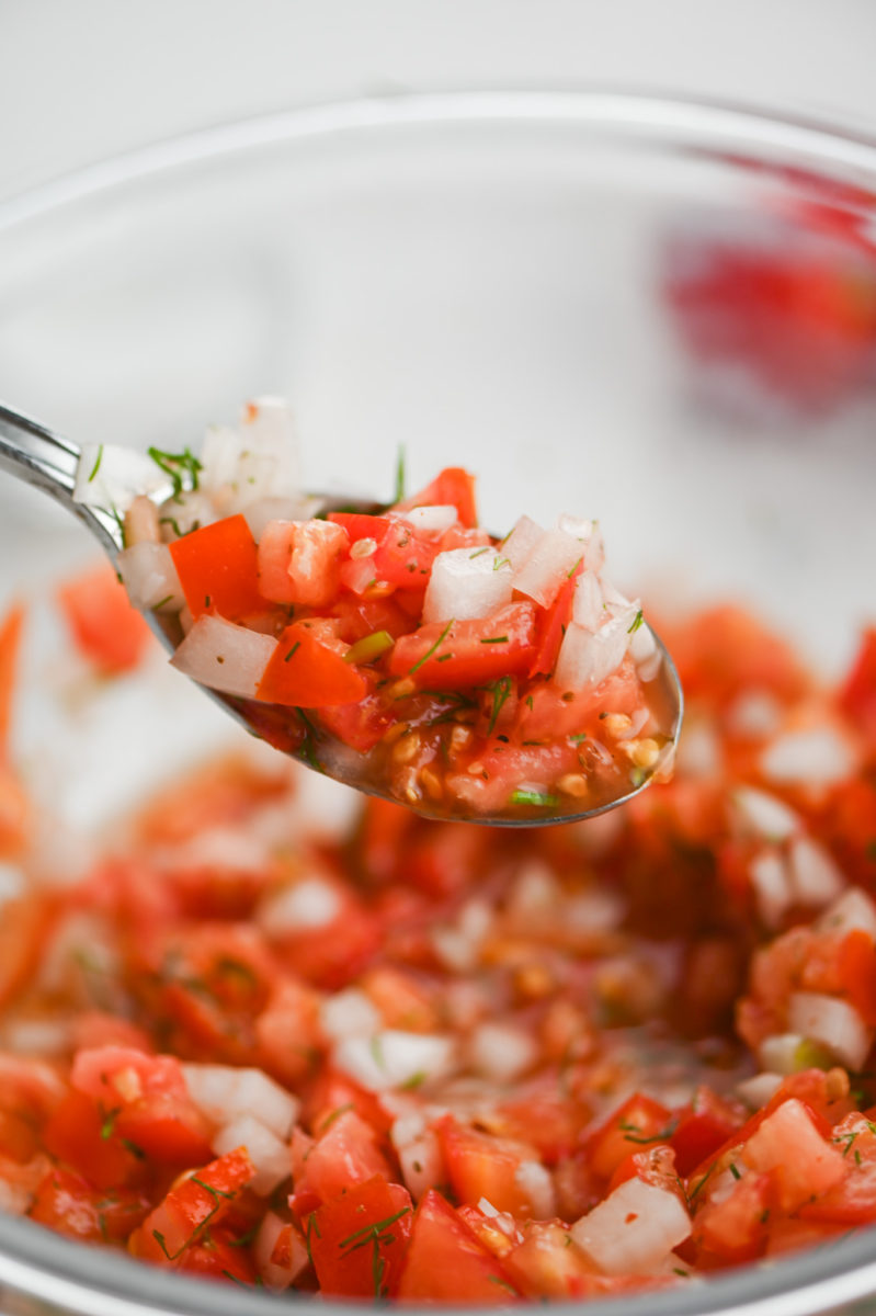 Making this Fresh Tomato Relish could not be any easier. The biggest thing is to make sure that you dice the tomatoes and onions small and try to keep them the same size.
