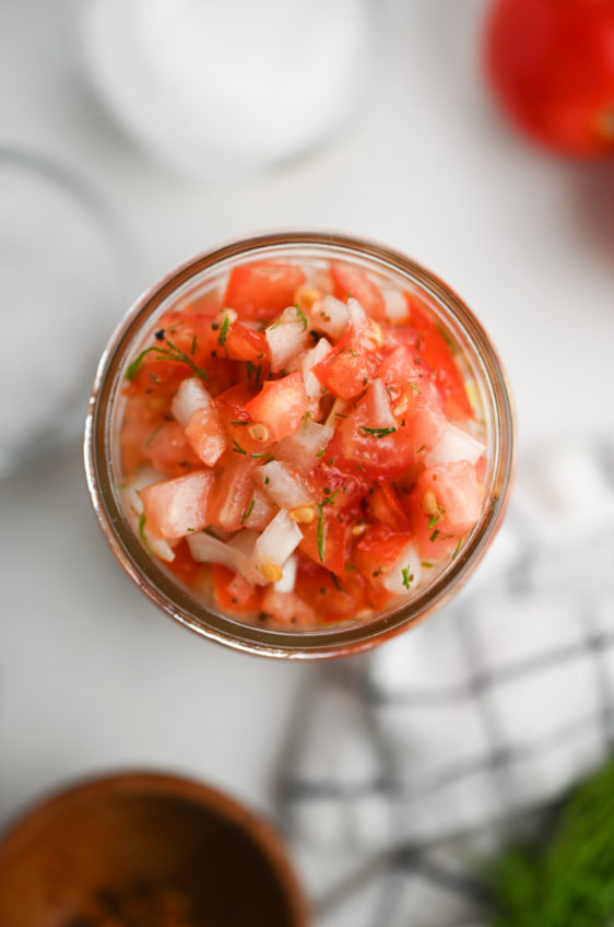 Fresh Tomato Relish made with tomatoes, onions, sugar, fresh dill and celery seed. Great on sandwiches, hot dogs and burgers!