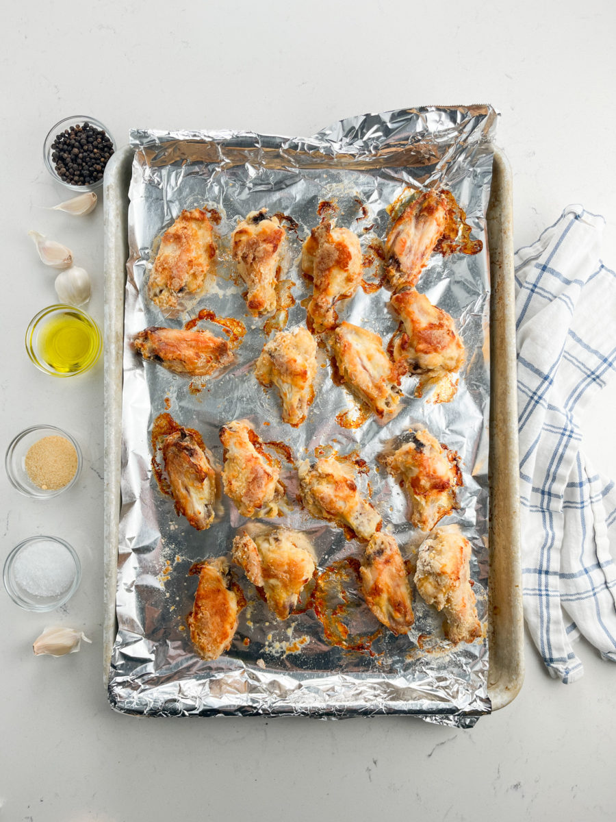 • STEP #3: Bake the wings in a single layer on an aluminum foil lined baking sheet (you may need two baking sheets) for 20 minutes. Turn and then bake another 15 – 20 minutes or until browned and cooked through.