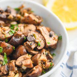 Roasting mushrooms is one of my favorite ways to cook mushrooms. Truth be told, I don’t think that you necessarily need to cook mushrooms for them to be delicious. I will eat mushrooms anyway that I can get them. They are one of my personal favorites, but my family on the other hand, aren’t super fans. So if I’m going to take the giant step and serve them as an actual side dish with dinner, then I’ve got to dress them up a bit. This recipe is the perfect way to do just that.