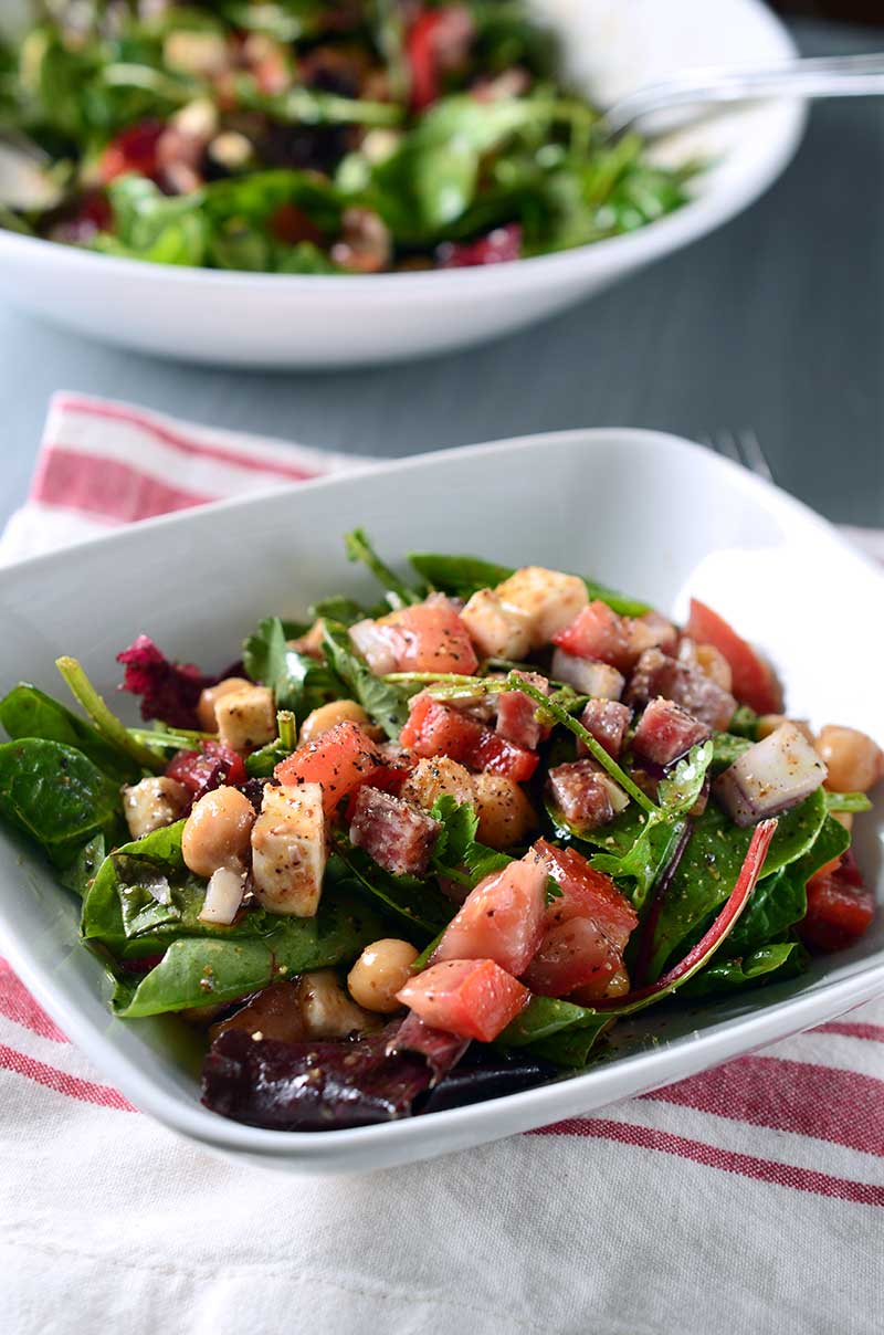 Mixing it up with different greens, different veggies and different proteins really helps keep things fresh. Some of my favorites are crispy chickpea and arugula salad, tarragon shrimp salad, a loaded greek salad and this Italian Chopped Salad.