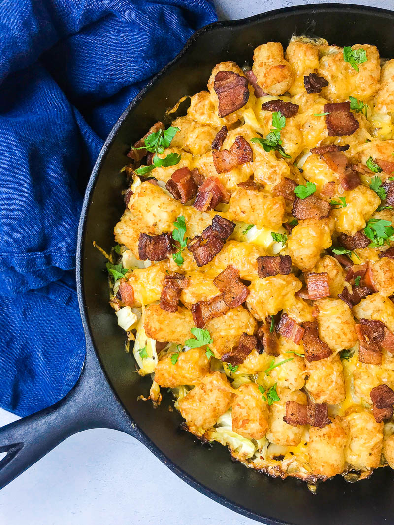 If you don’t have a cast iron skillet, or other oven-proof skillet, simply prepare the kielbasa and cabbage in a skillet and then transfer the whole thing to a casserole dish before topping it with the tater tots.
