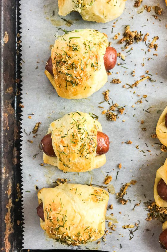 Most pigs in a blanket recipes leave it at that, but I wanted to make this one a bit more interesting by adding garlic, parmesan and dill.