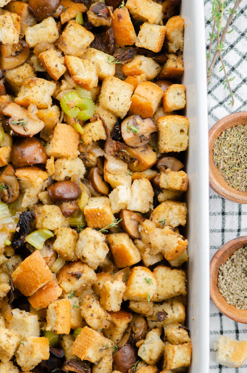 For this Mushroom Stuffing recipe, I decided to take classic stuffing up a notch by introducing the umami packed flavor of mushrooms. They add an earthy heartiness to this stuffing that is sure to be the hit at your holiday table.