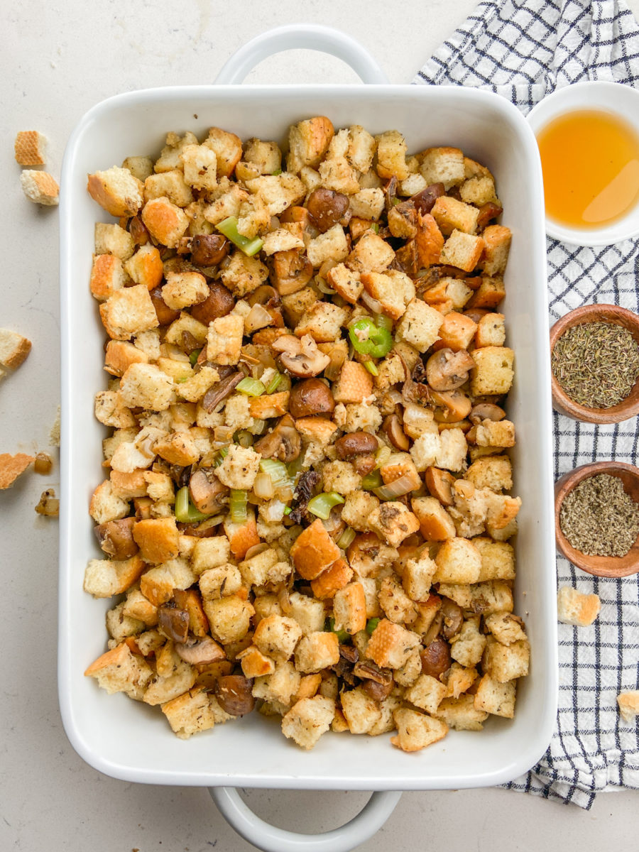 STEP #4: Place the bread pieces in a large bowl. Pour the mixture over the top and mix to combine. Add 1 – 2 tablespoons of mushroom water. Add in thyme, sage, salt and pepper and chicken broth.