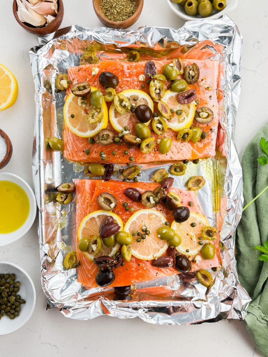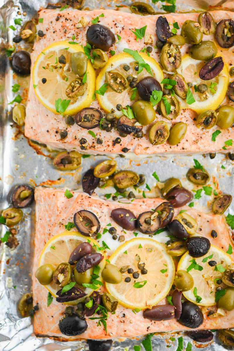 STEP #2: Place salmon filets on prepared pan. Drizzle with olive oil, sprinkle with salt, pepper and Italian seasoning. Top with lemon slices and olive mixture. Bake in preheated oven for 20 minutes or until salmon reaches 135 degrees. It will continue cooking when you remove it from the oven.