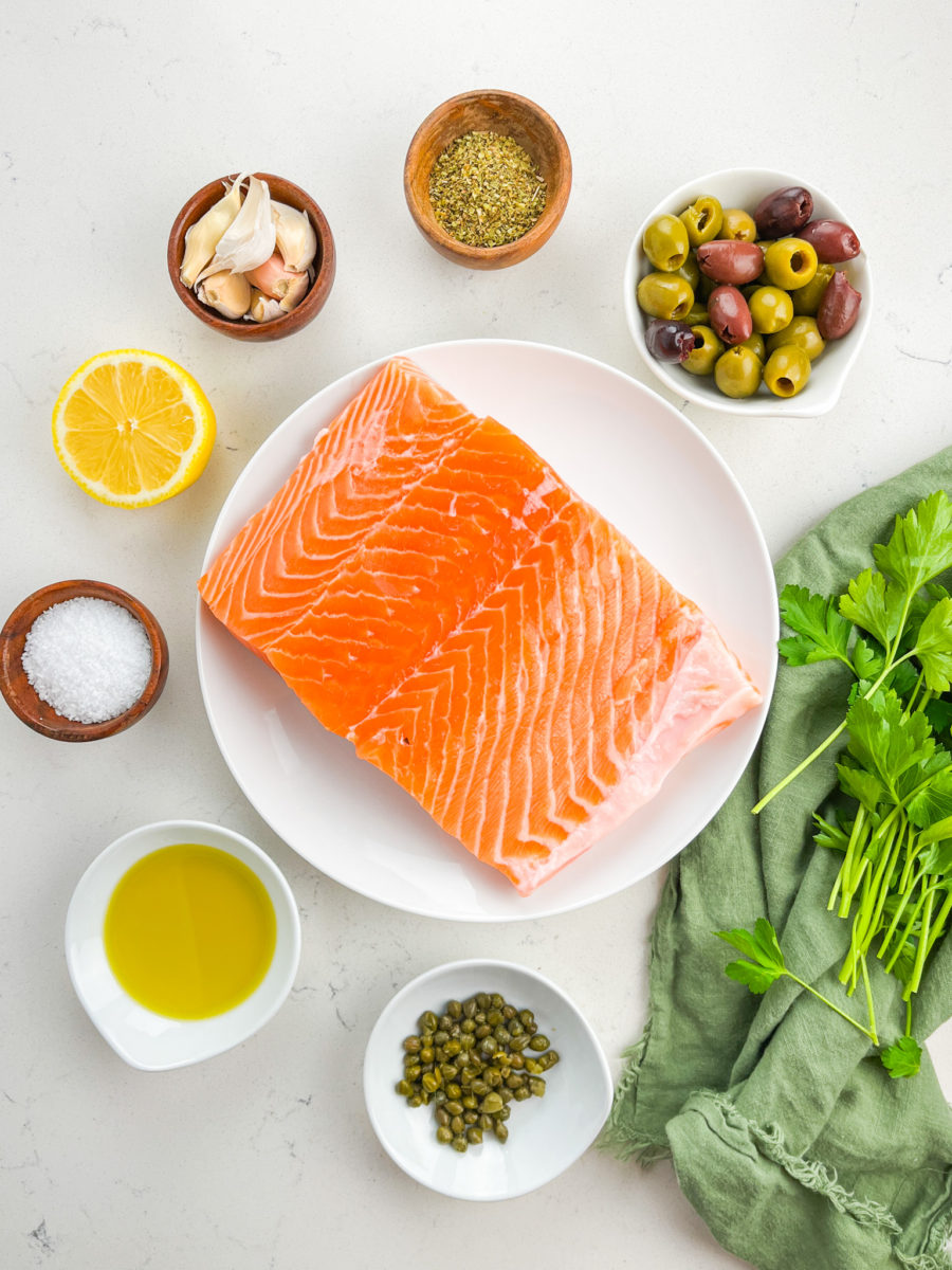 Making Oven Roasted Salmon is really easy! For this recipe, you’ll make the olive mixture first then put it on top of the salmon before baking. And that’s it! Told you it was easy.