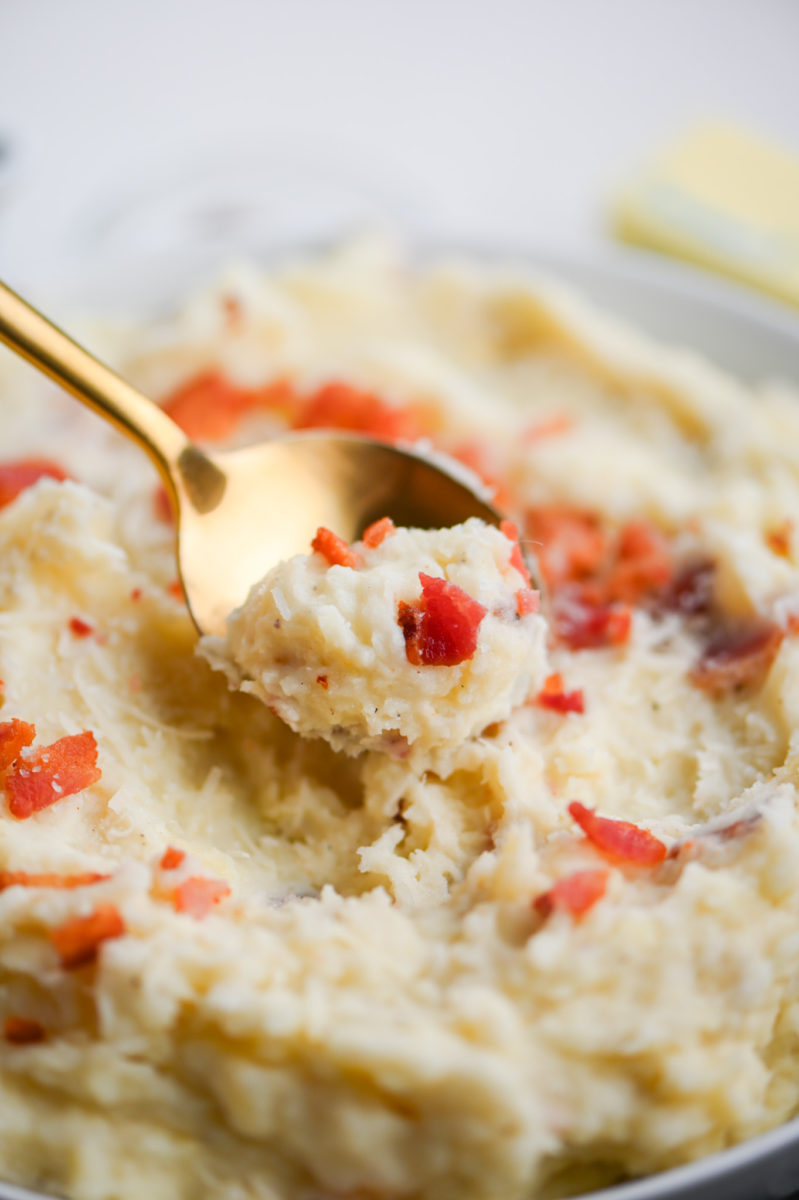 They are often roasted, pureed or sometimes added to soups and stews. And in this case, boiled with russet potatoes and mashed with bacon and Parmesan to add more decadence.