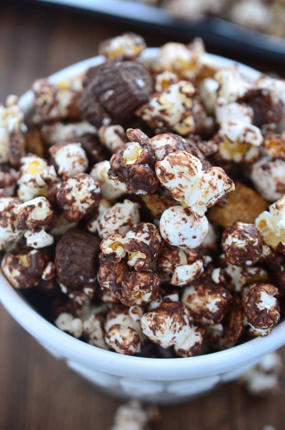 Peanut Butter Cup S’mores Popcorn has so many of your favorite goodies all rolled into one. Salty popcorn tossed with mini peanut butter cups, mini marshmallows and graham cereal and then drizzled with melted chocolate. It’s the ultimate peanut butter chocolate popcorn snack mix recipe, and you’re going to love it!