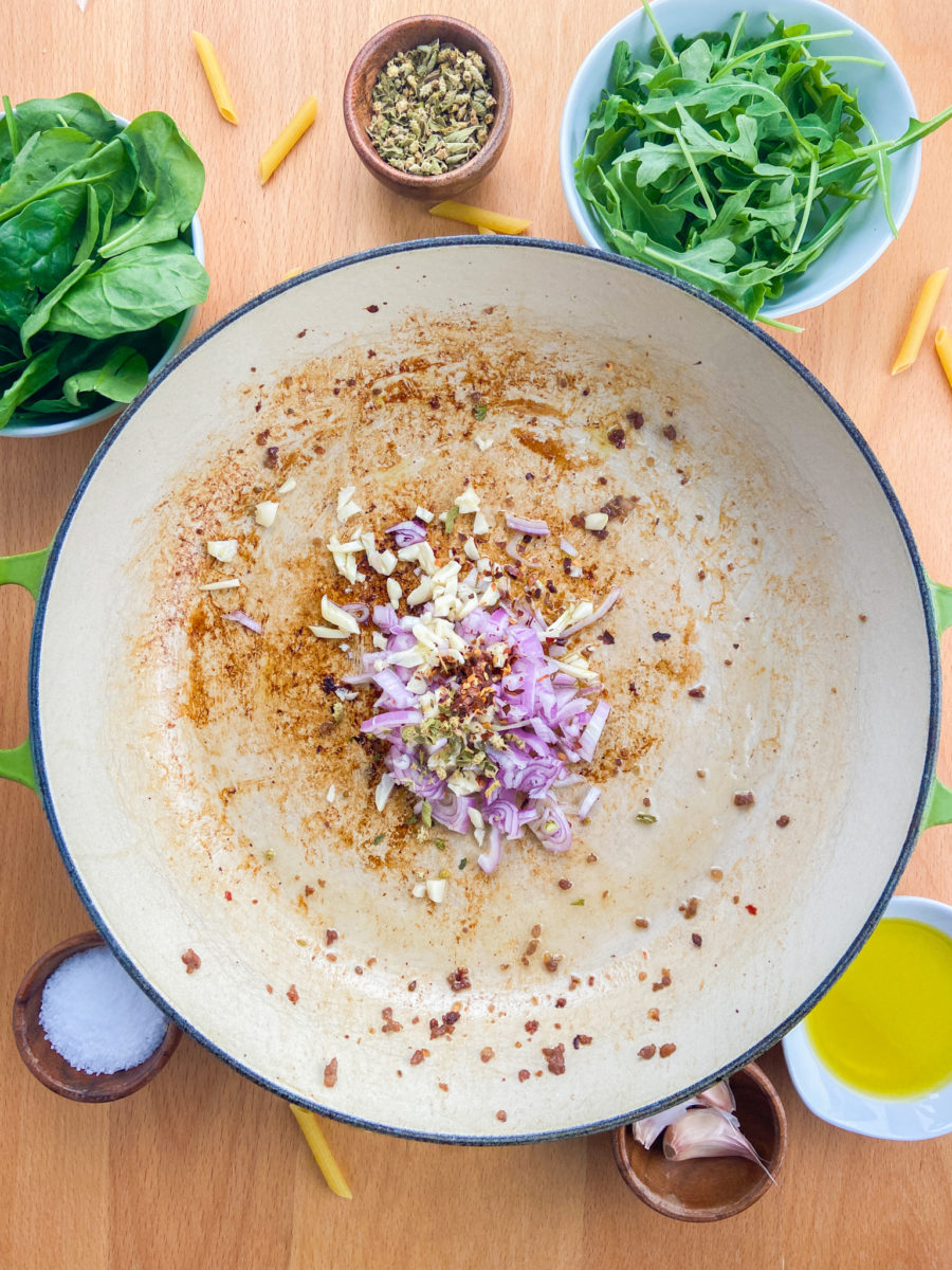 STEP #3: In the same pan, saute olive oil, shallots, garlic, oregano and crushed red pepper.