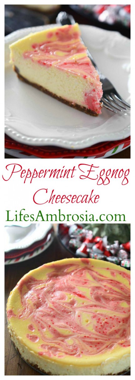 Luscious eggnog cheesecake is swirled with melted Hershey’s Candy Cane Kisses in this Peppermint Eggnog Cheesecake making it a perfect holiday treat!Â