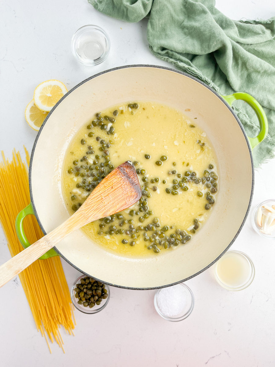 STEP #2: While you’re waiting for the water to boil and the pasta to cook, heat olive oil and butter in a large skillet over medium heat until the butter melts. Once melted add capers and garlic. Cook just until the garlic becomes aromatic, 30 seconds – 1 minute.