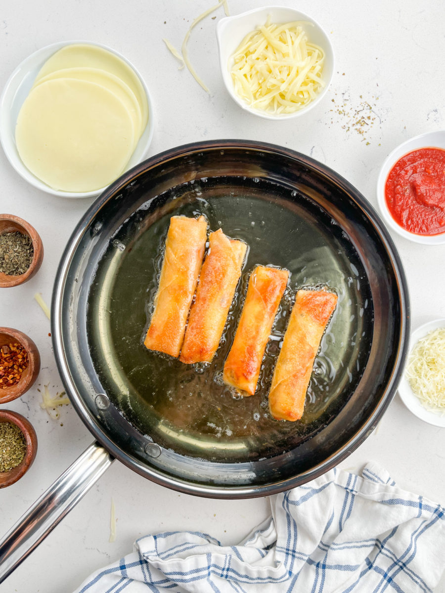 Heat 1/2 inch of oil in a skillet over medium heat to 350 degrees. Cook egg rolls, in batches if necessary, until golden brown. About 2 minutes. Repeat until all egg rolls are fried.